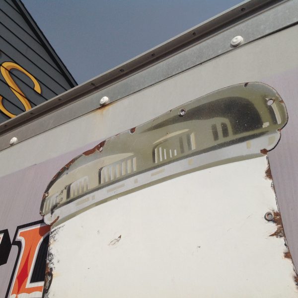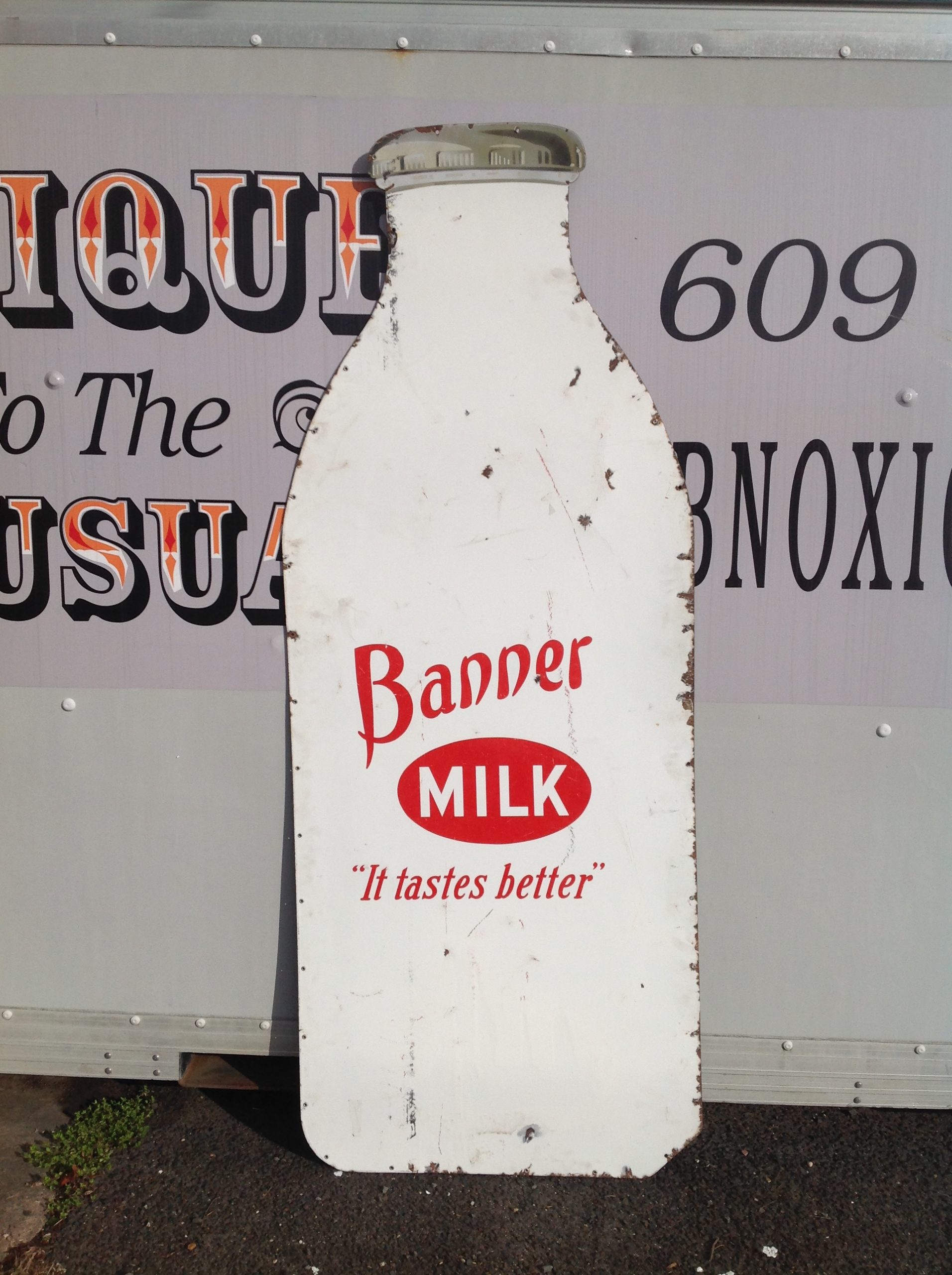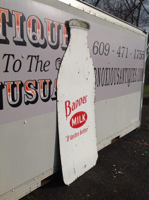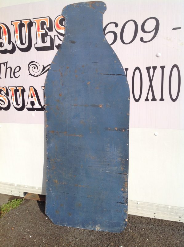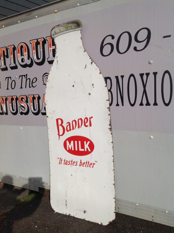Antique porcelain Banner Milk Bottle advertising sign in as found condition. Measures 80″ high x 36″ wide, showing signs of wear with surface chips and cut at lower right corner as shown in photo. Will display well…………