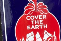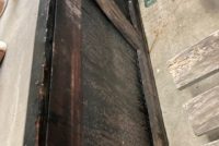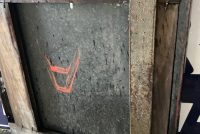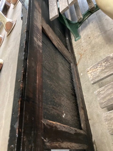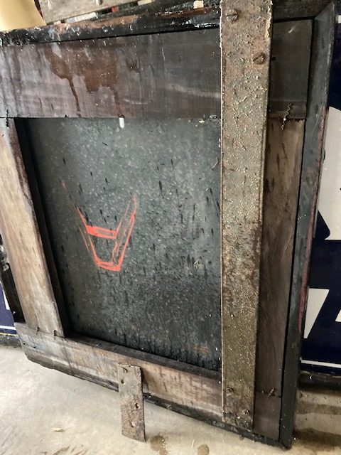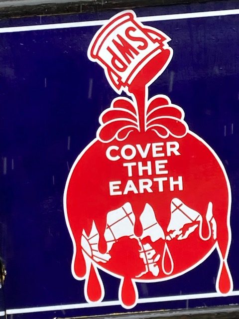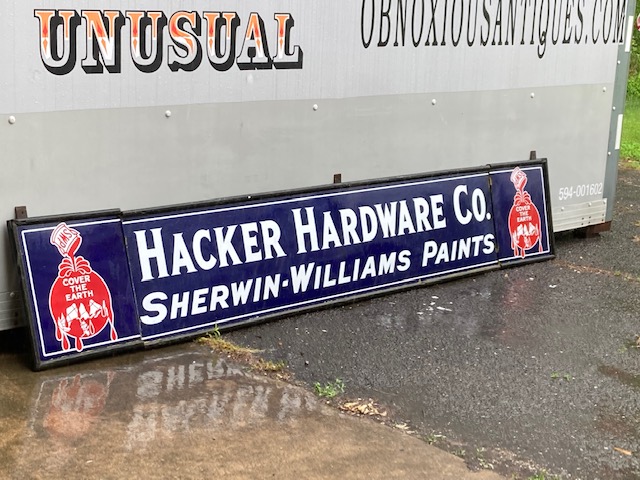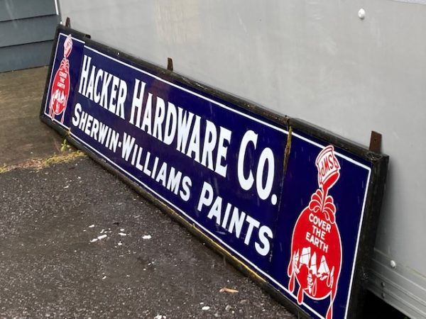 Antique “Cover The Earth” porcelain Sherwin Williams paint hardware sign in as found condition. Perfect in every way, measuring 12′ long x 2′ high. 3 sections. No excuses for this sign. Heavy porcelain over steel construction with wood frame………