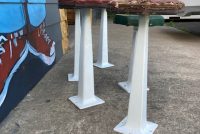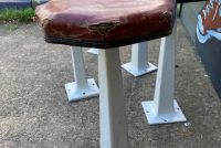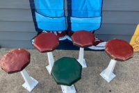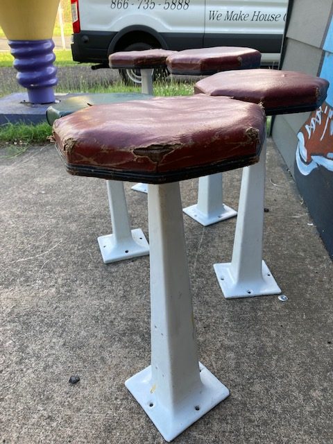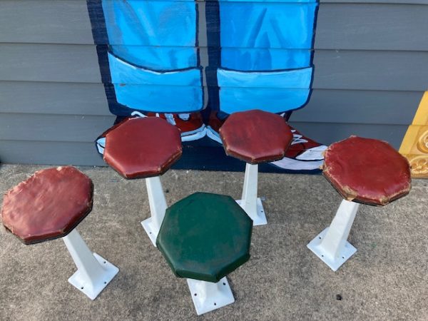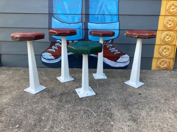 Set of 5 antique porcelain over steel soda fountain stools in as found condition. Green stool is shorter in height than the other 4. Nice porcelain overall but the cushion tops will need restoration. Sold as a set only………