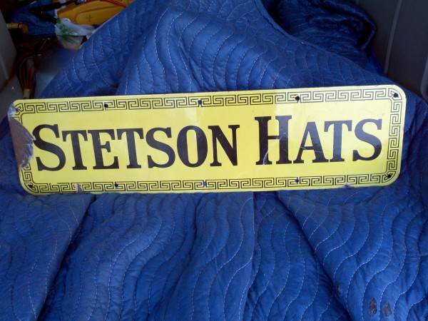 Vintage porcelain over steel Stetson Hats heavy metal sign in as found condition. Measures nearly 24″ ling x 7″ wide. Has a few dings but a rare sign for any collection. Not many of these around……..