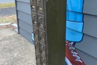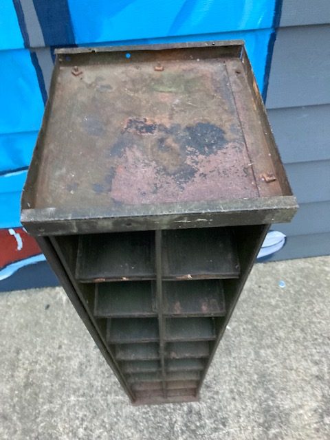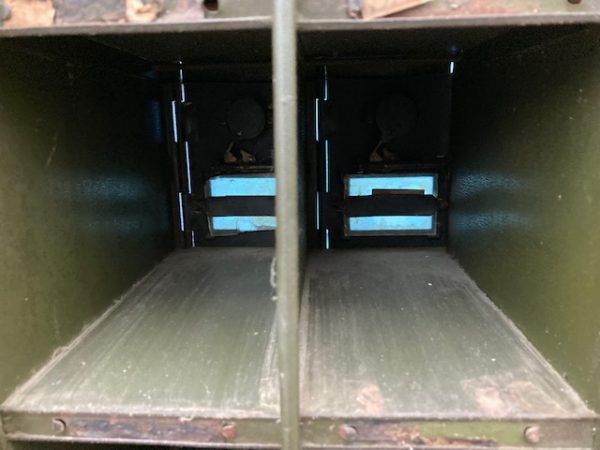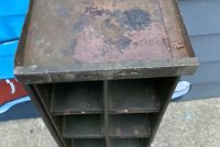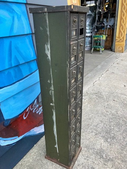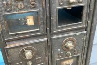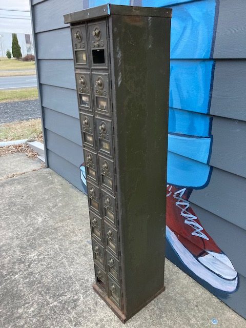 Interior antique U.S. office mailbox in as found condition. Appears to be complete with the exception of 2 missing pieces of glass and a knob. Will fit almost anywhere, measuring only 9″ deep x 10″ wide x 46″ high.