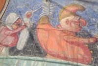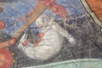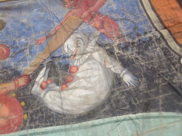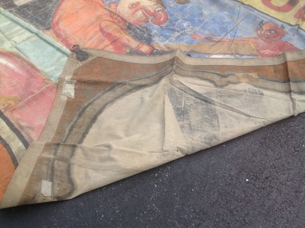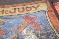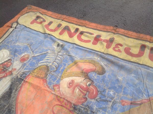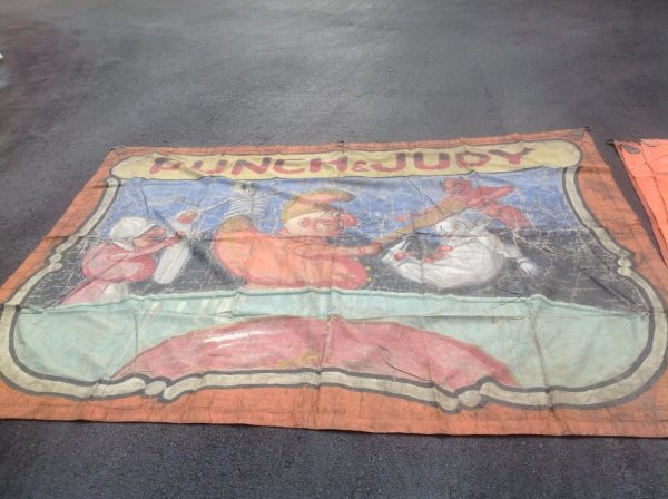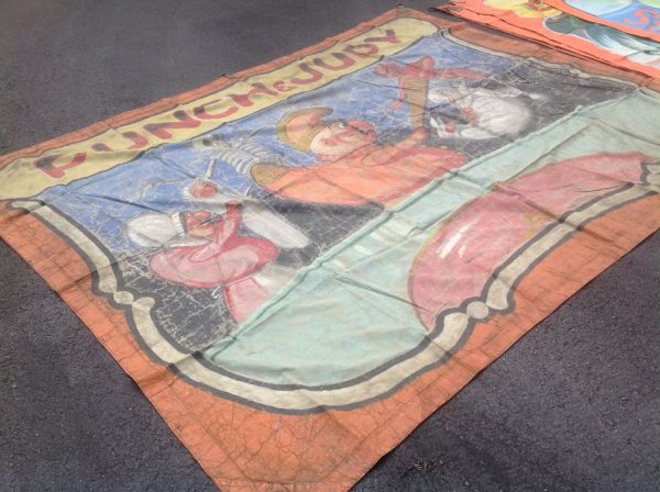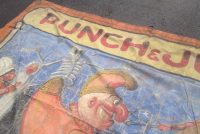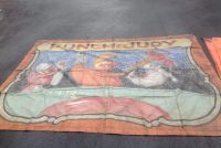 Antique large canvas Punch & Judy sideshow banner in as found condition. Some paint fading but otherwise a nice old example of sideshow art……….