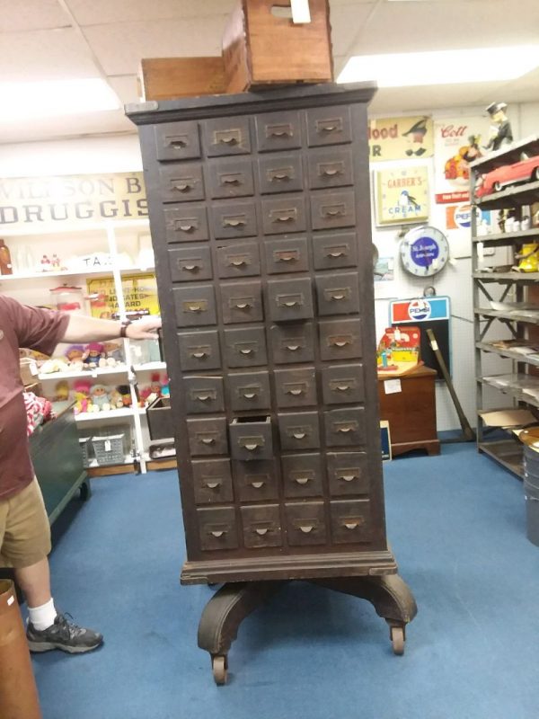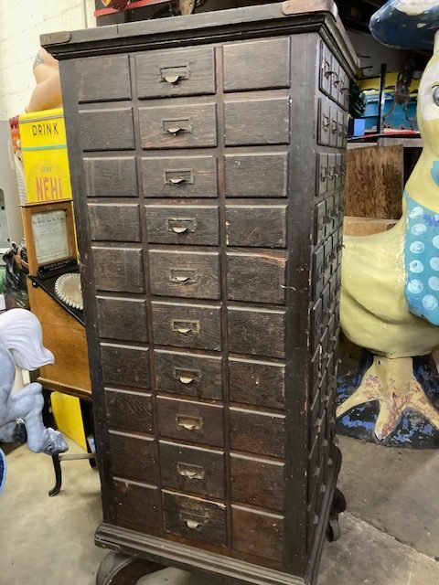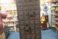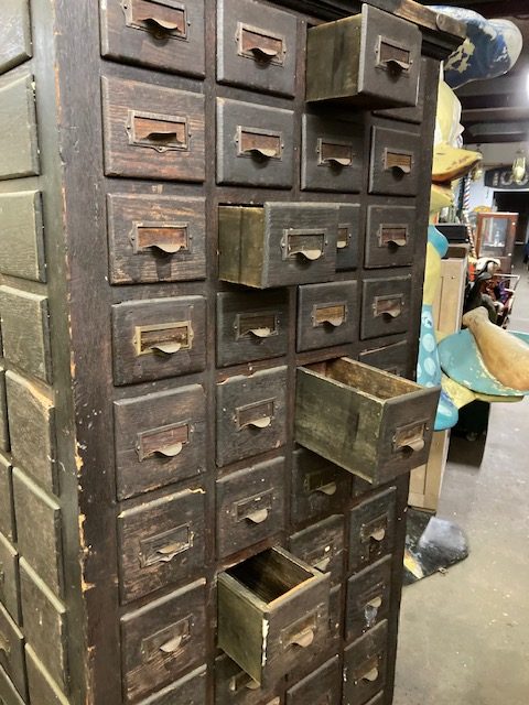 Rare antique rotating multi drawer hardware cabinet in as found condition. Unit somes complete with 100 drawers for all those hardware parts. Dates from around the 1890’s and is very heavy. Everything looks original down to the minor nicks and dings to drawer fronts. Measures almost 7′ tall. Don’t think you will find another anytime soon. Buy while it’s still available………..