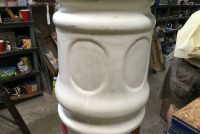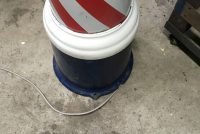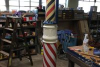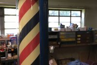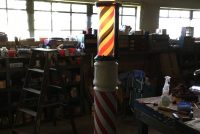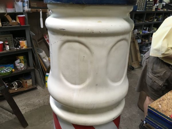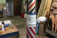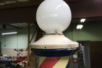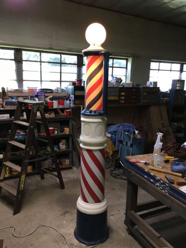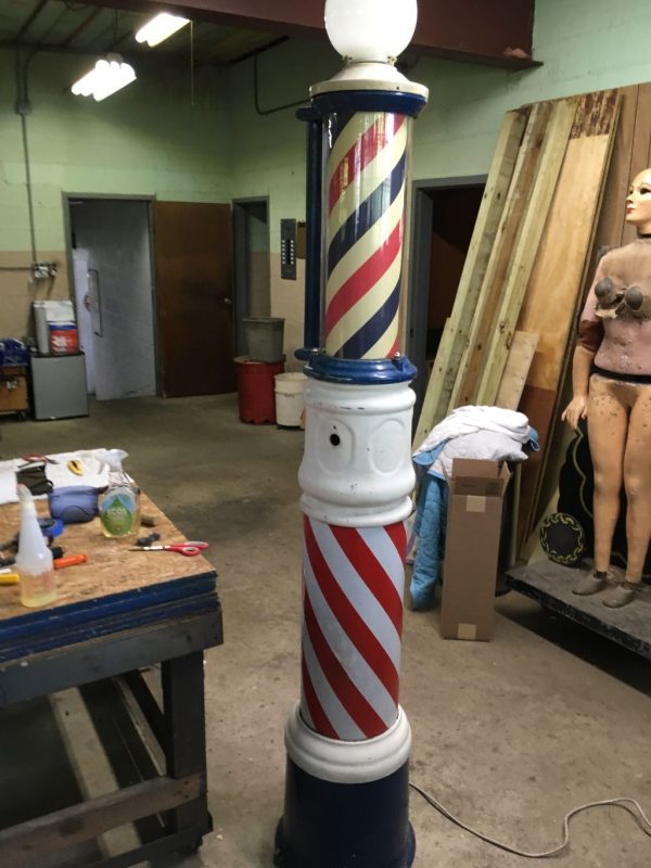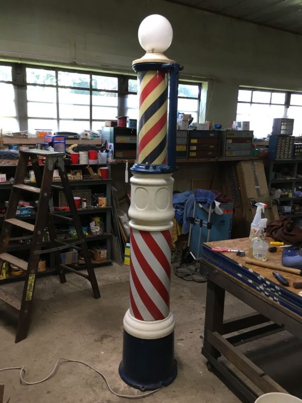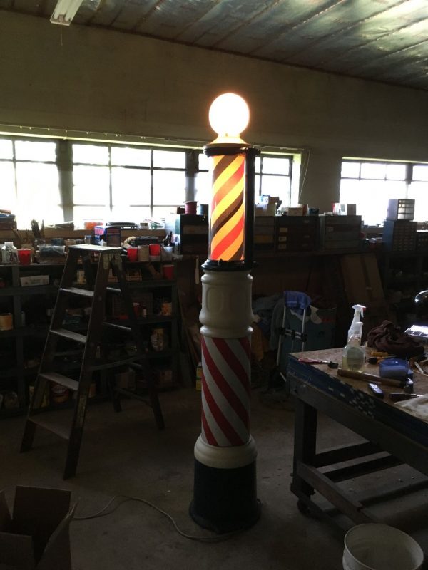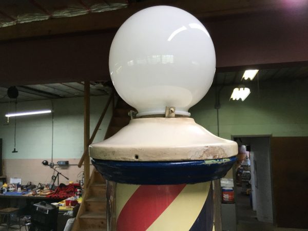 Antique upright sidewalk street corner barber pole in working condition. Complete with new motor, inner paper cylinder installed. Nice overall condition with only a few chips.