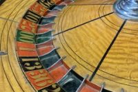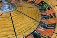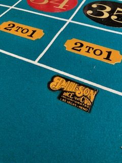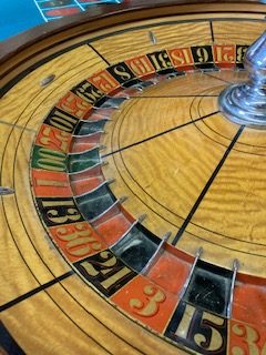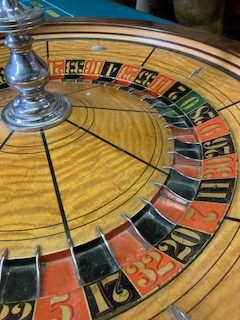 Vintage Mason & Co. roulette table and wheel in as found condition. Nice condition overall with good felt with the exception of a missing cash drawer. Wheel spins freely. Set up a speakeasy in your home and impress your friends………….