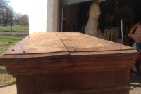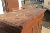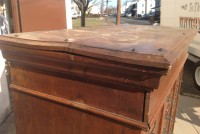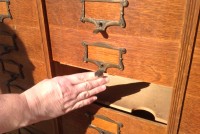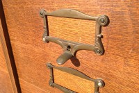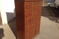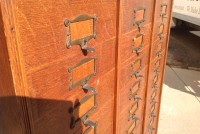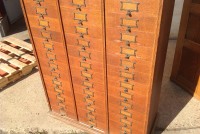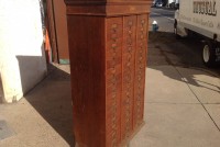 Antique tall multi drawer document cabinet, right out of a now closed law office, in as found condition. Neat construction as you lift the drawer front to obtain entrance to drawer contents. Nice patina with some warp damage to cabinet top. Rare to find one in this condition……….
