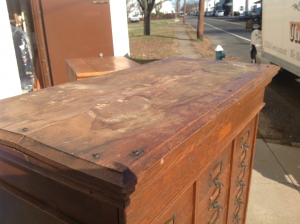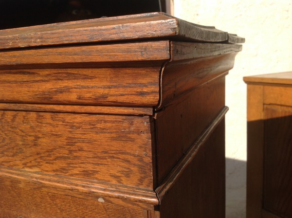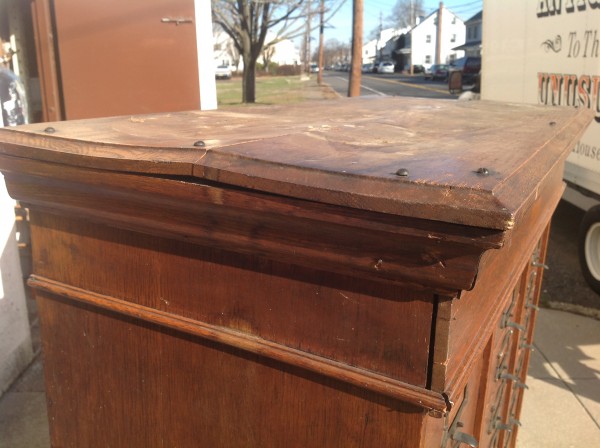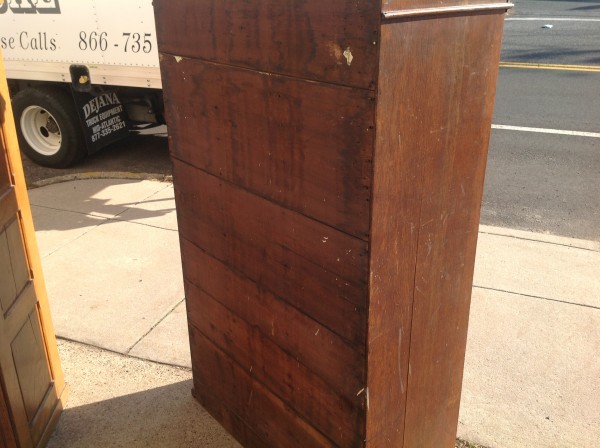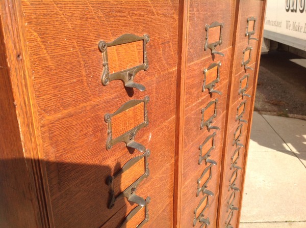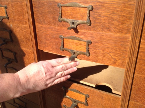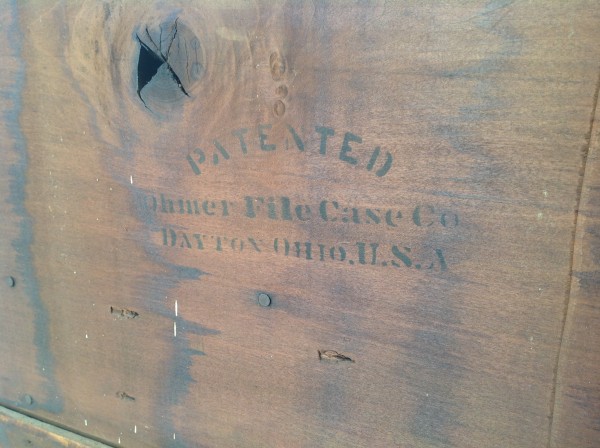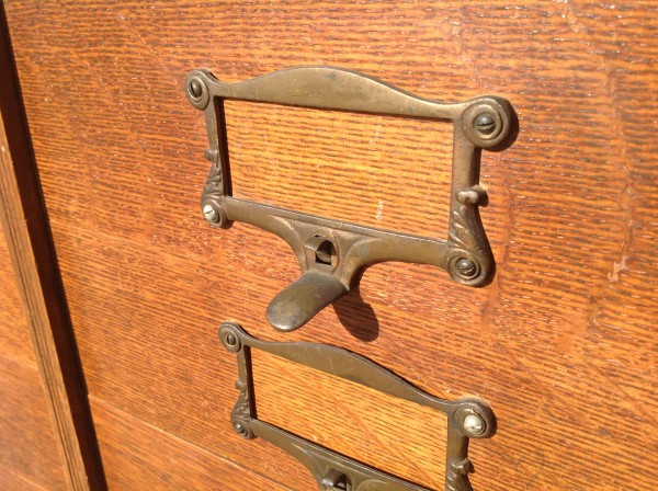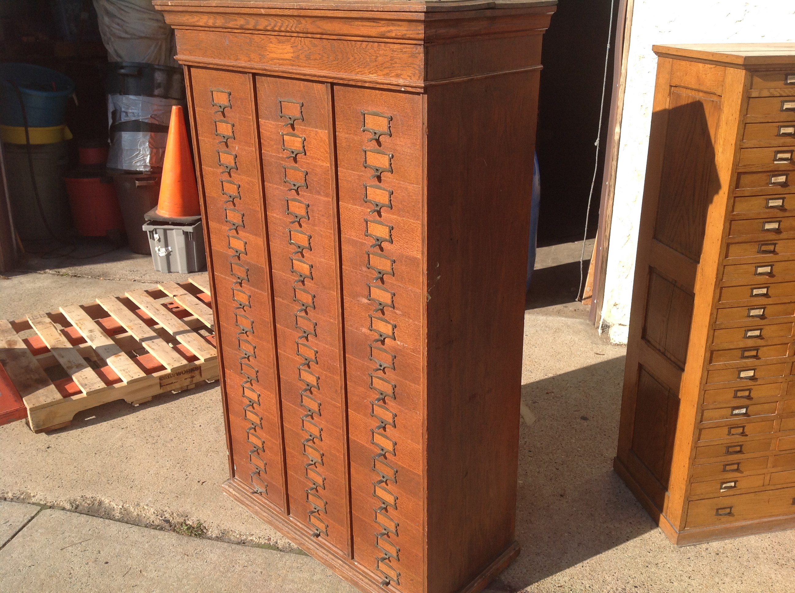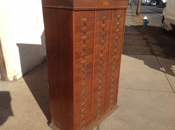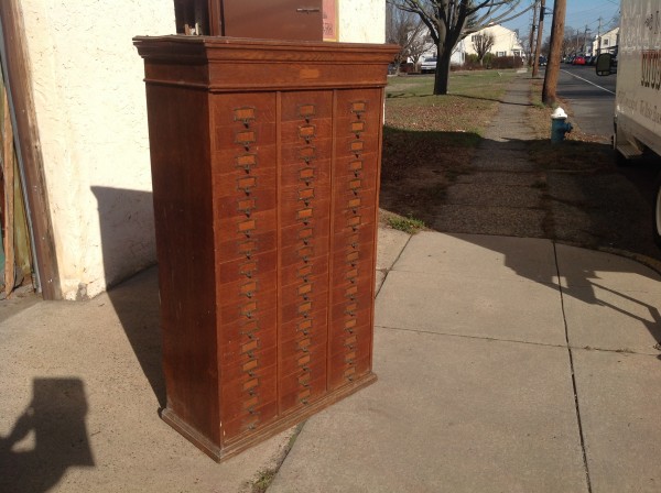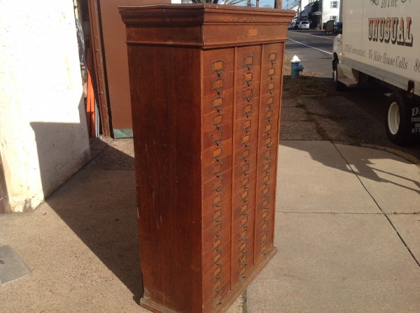 Antique tall multi drawer document cabinet, right out of a now closed law office, in as found condition. Neat construction as you lift the drawer front to obtain entrance to drawer contents. Nice patina with some warp damage to cabinet top. Rare to find one in this condition……….