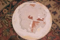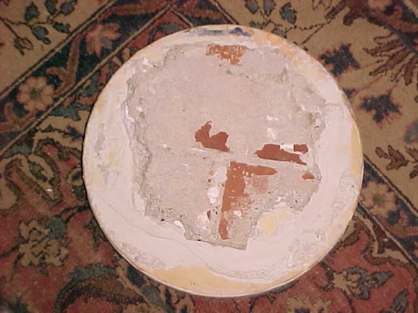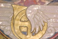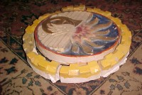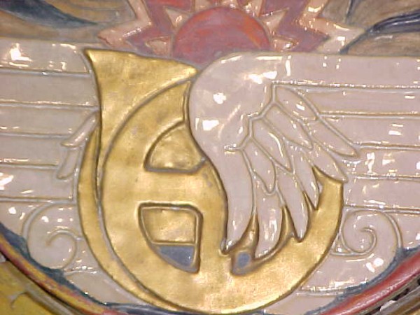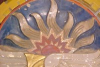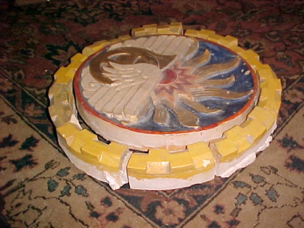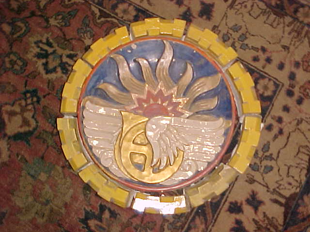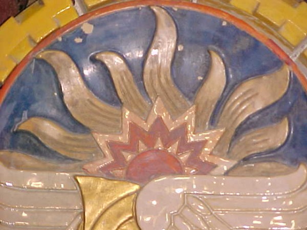 Wonderful terracotta symbol element from the now destroyed Church of the Transfiguration, Philadelphia, Pa. This stone and brick church was built in 1928 and torn down in 2009. Only a few items were saved and are available for sale now. Great bright colors and the details are amazing.The yellow edges are separate from the element. Measures 18″ in diameter and 3″ thick…………