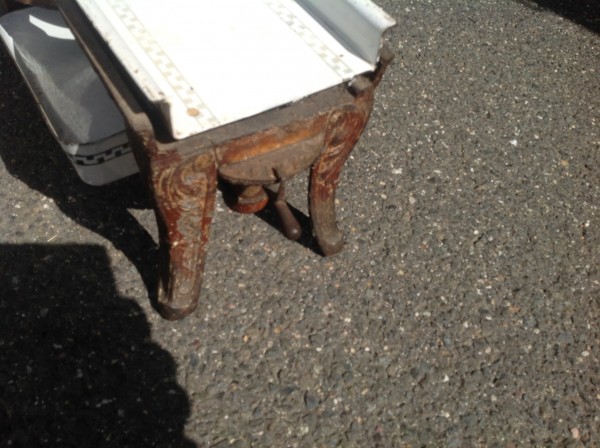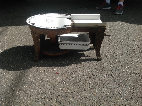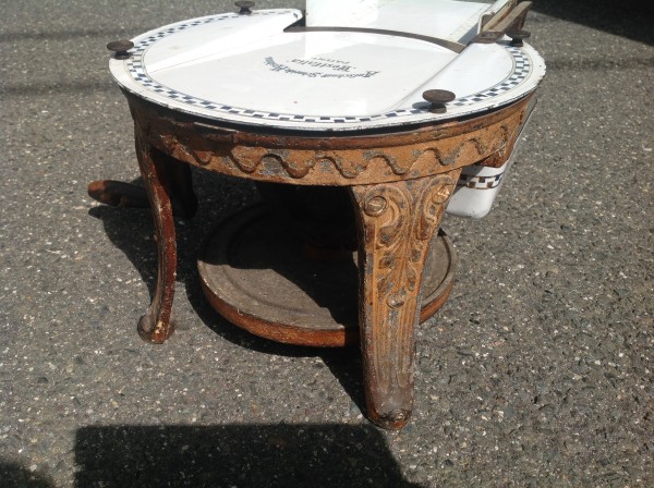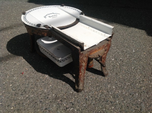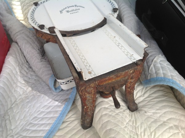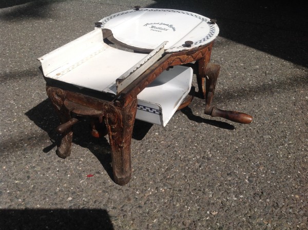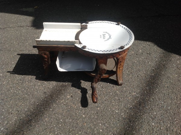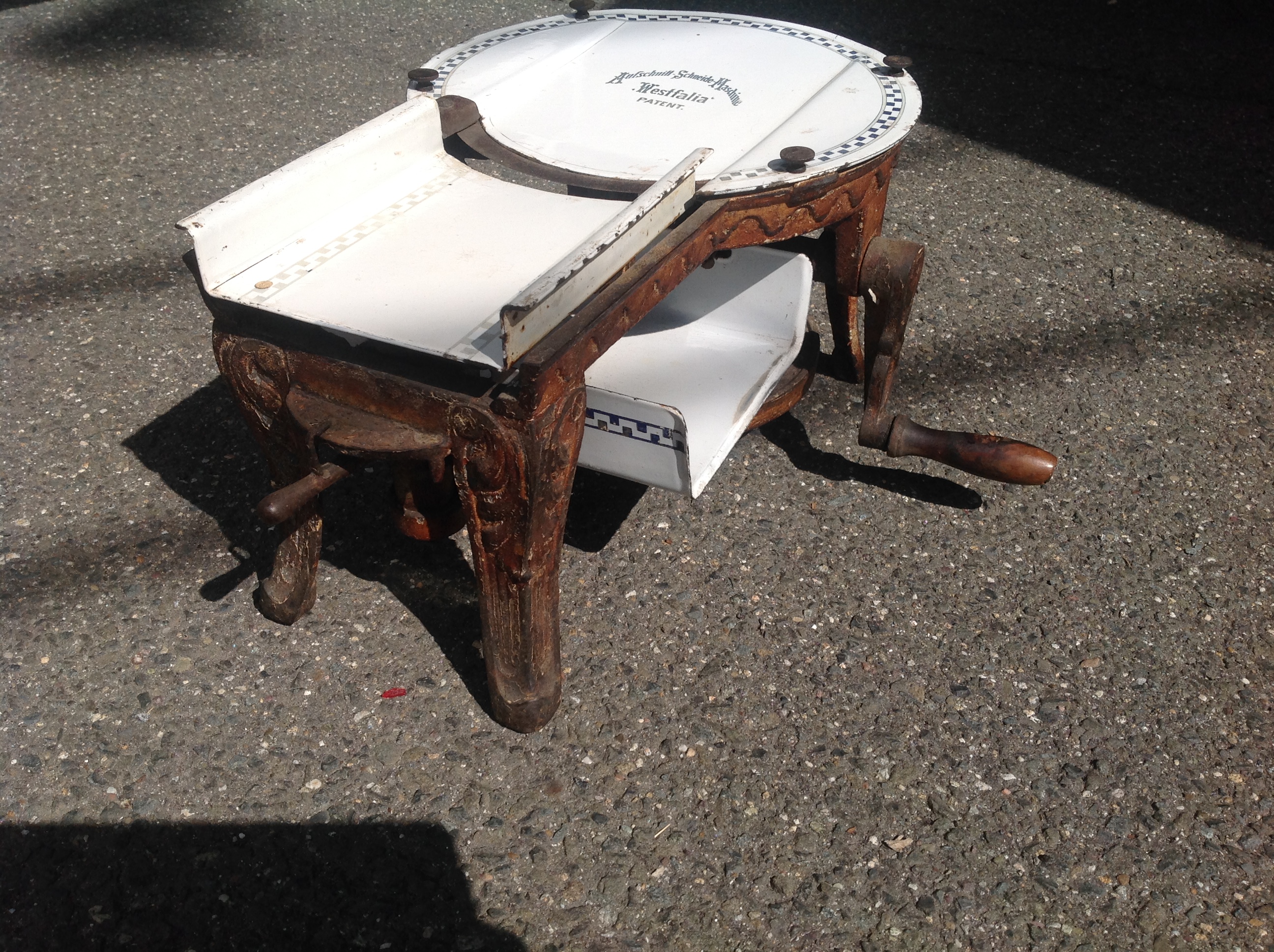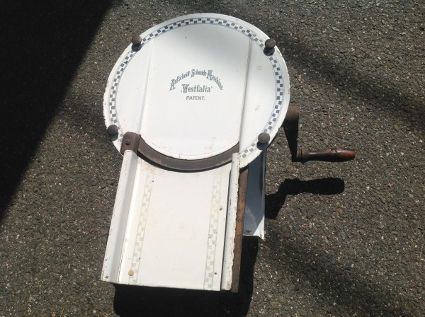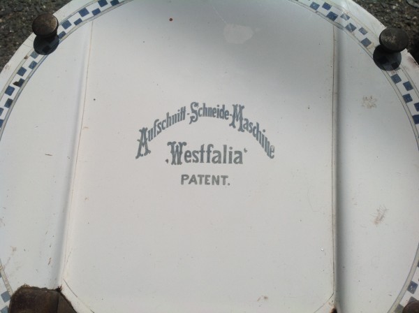 Antique Westfalia German cast iron and porcelain butcher shop meat slicer in as found condition. Looks to be complete with the exception of a few screws that are not original. Will need to be oiled but works fine. Nice kitchen item…………..
