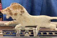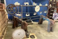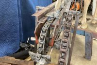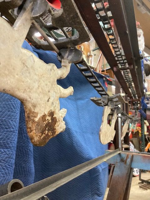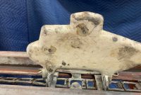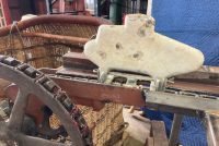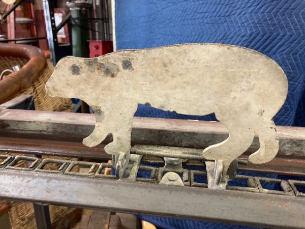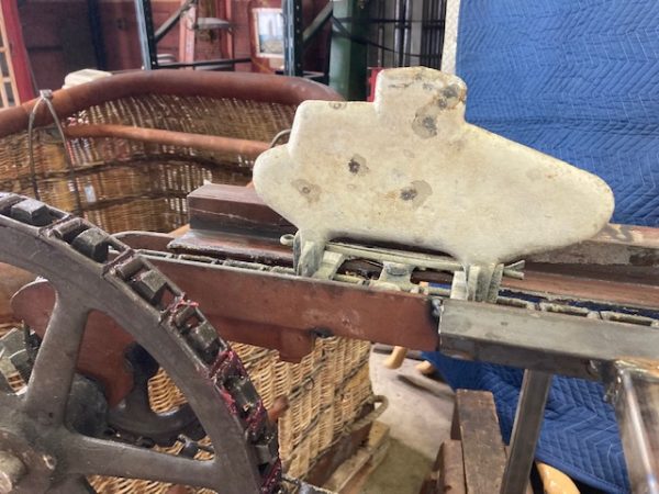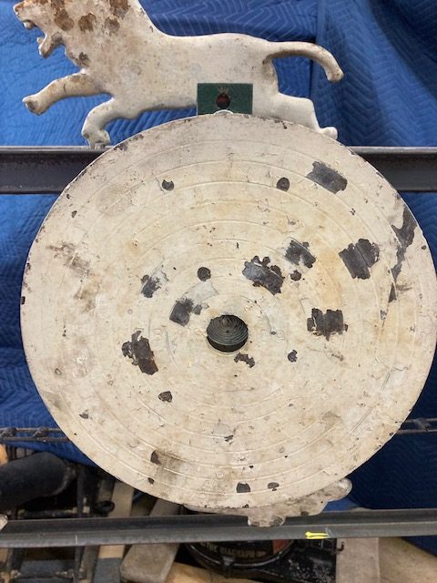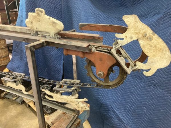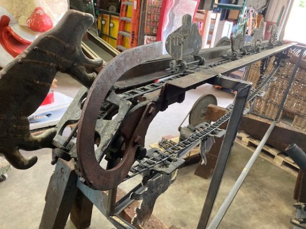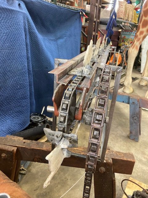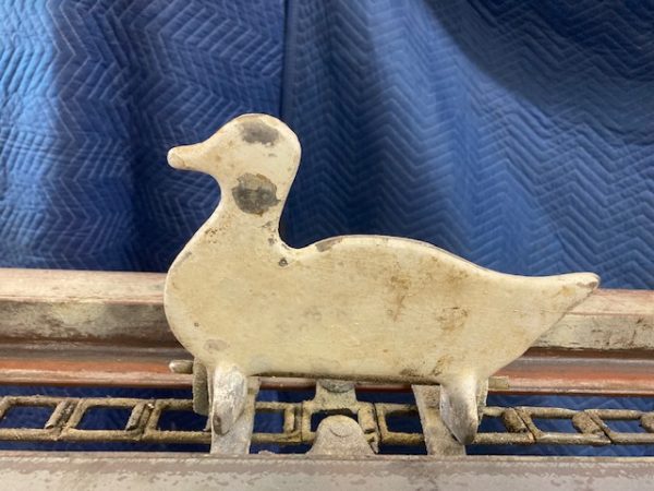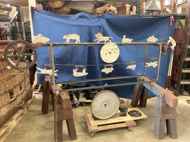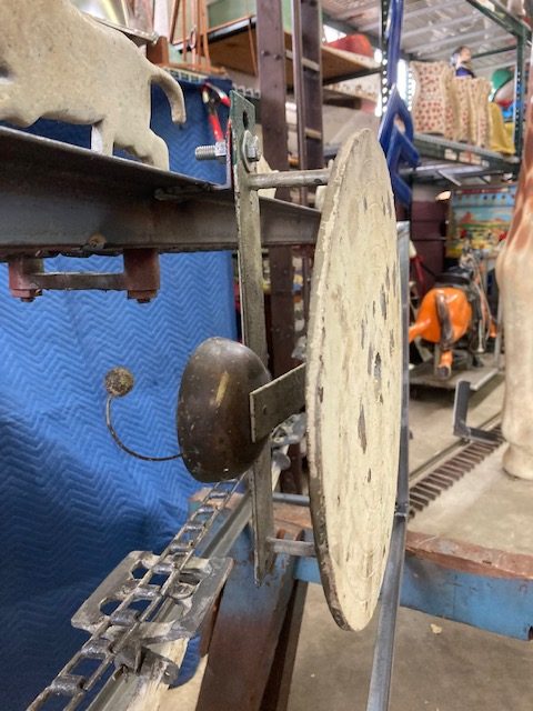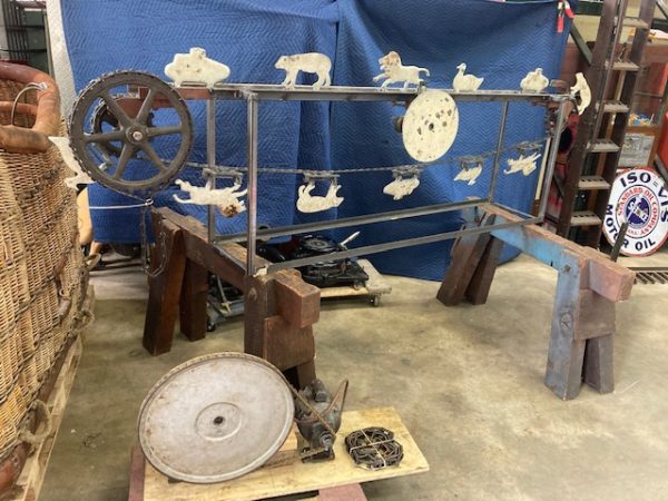 Wonderful old antique cast iron Mangels shooting gallery in as found working condition. Rare to find one of these in working condition complete with original motor and linked chain. Ready to be set in a wall or man cave setting for years of enjoyment. Video is available showing all the movements, just ask. Complete with 12 targets and 1 center bull eye. 9 1/2 ‘ long x 32″ tall”  with targets standing. Bulls eye measures 12″. Once in a lifetime opportunity to own a real piece of carnival/boardwalk Americana……………….