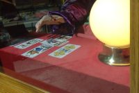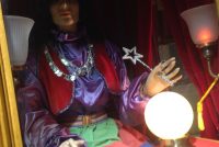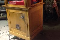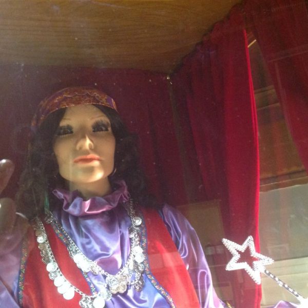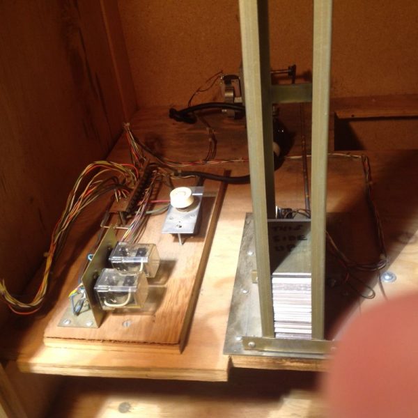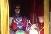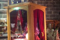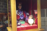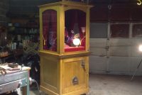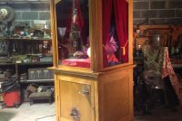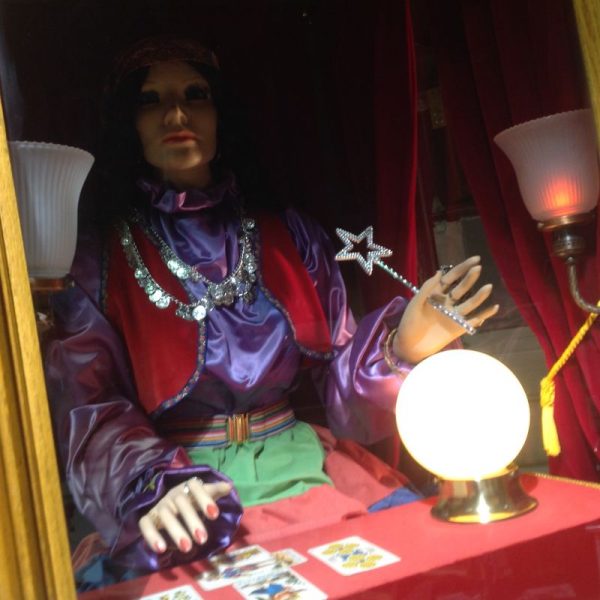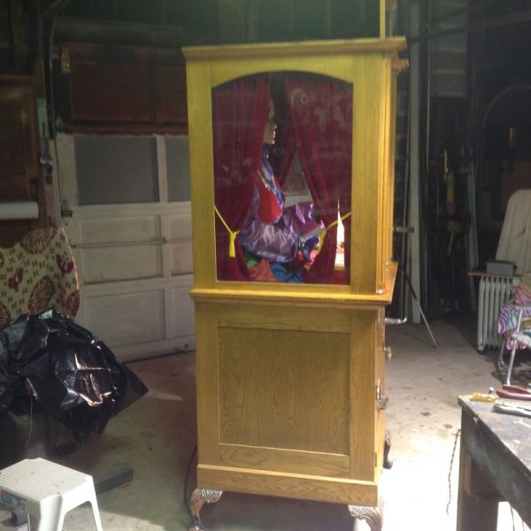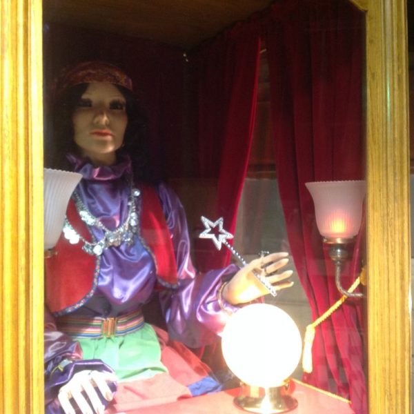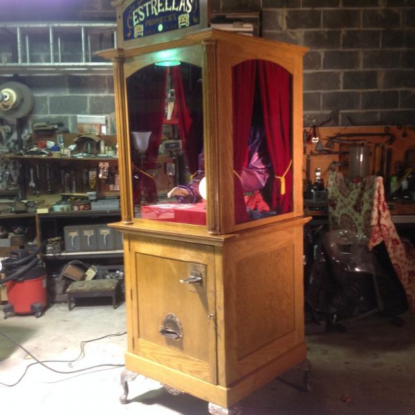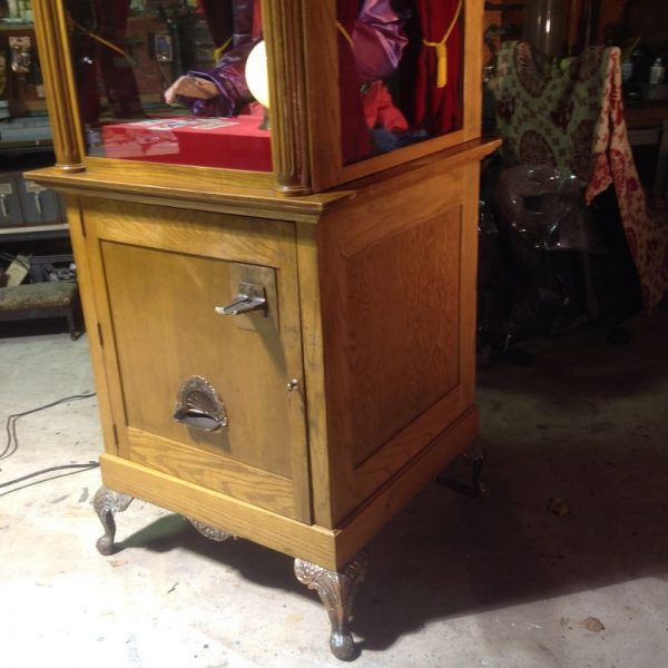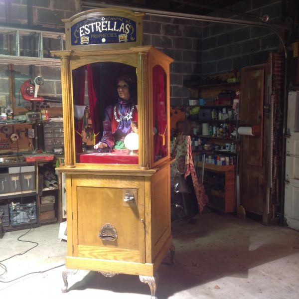 Wonderful limited production older arcade coin operated Estrella Gypsy fortune teller machine in as found working condition. Oak cased fortune teller machine stands over 7′ tall with ornate metal castings. Machine dispenses a fortune card with the insertion of a coin. Estrella moves her head side to side as the left arm/hand moves up and down while the right arm moves left to right across the fortune cards. Her chest also heaves giving the appearance of breathing. She leaves you with the impression she is watching you closely. Very well constructed and works fine. Comes complete with a large supply of fortune cards. Don’t let this get away………..