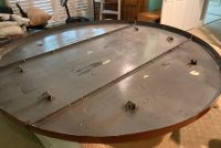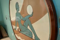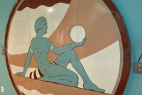 One of a kind vintage Art Deco Theater Washington,DC porcelain over steel sign in as found condition, Massive sign measuring about 8′ in diameter from the Apex Theater, 48th Street and Massachusetts Avenue NW back in the 1940’s. The Apex Theater was a beautifully designed streamlined modern style movie house designed by renowned architect John Zink. Opening for business on November 20, 1940 with Don Ameche in “Down Argentine Way”. You will never find another. Excellent shape and beautifully designed. Found in a Baltimore Estate where it was used as a “head board” for the past 40 years. Easy to transport as it comes in 3 sections………