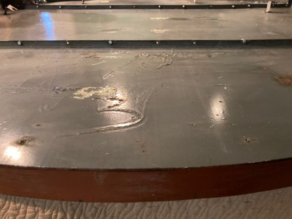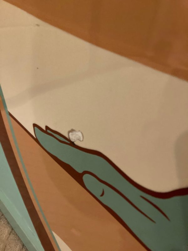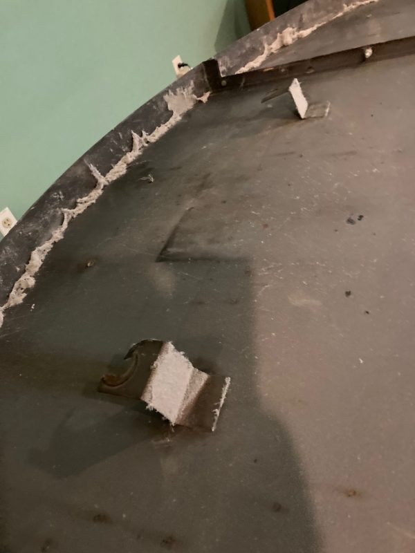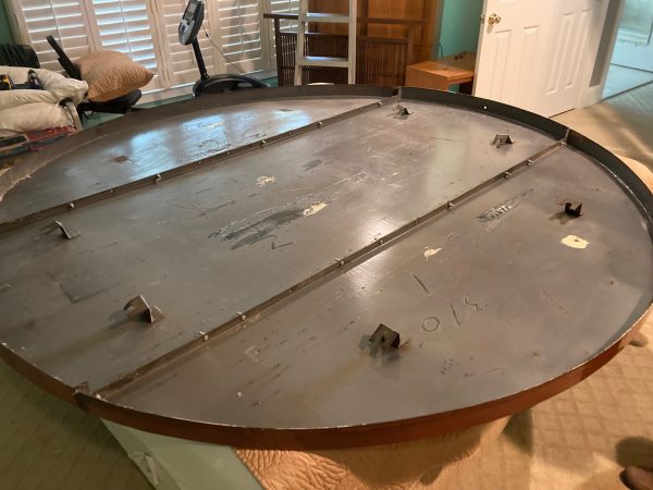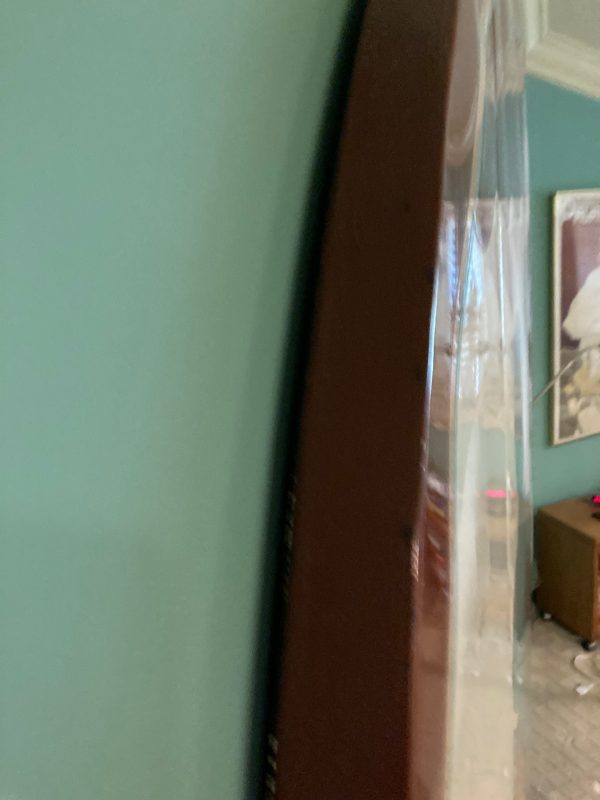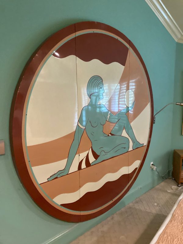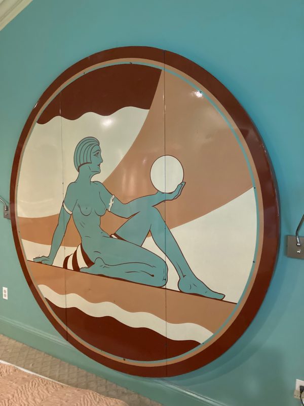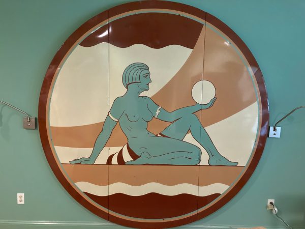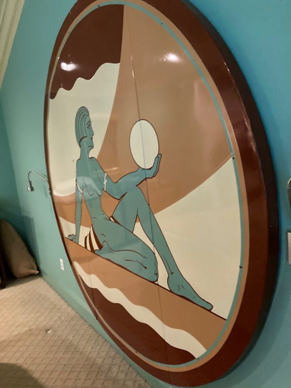 One of a kind vintage Art Deco Theater Washington,DC porcelain over steel sign in as found condition, Massive sign measuring about 8′ in diameter from the Apex Theater, 48th Street and Massachusetts Avenue NW back in the 1940’s. The Apex Theater was a beautifully designed streamlined modern style movie house designed by renowned architect John Zink. Opening for business on November 20, 1940 with Don Ameche in “Down Argentine Way”. You will never find another. Excellent shape and beautifully designed. Found in a Baltimore Estate where it was used as a “head board” for the past 40 years. Easy to transport as it comes in 3 sections………