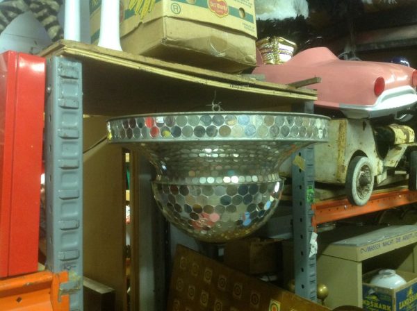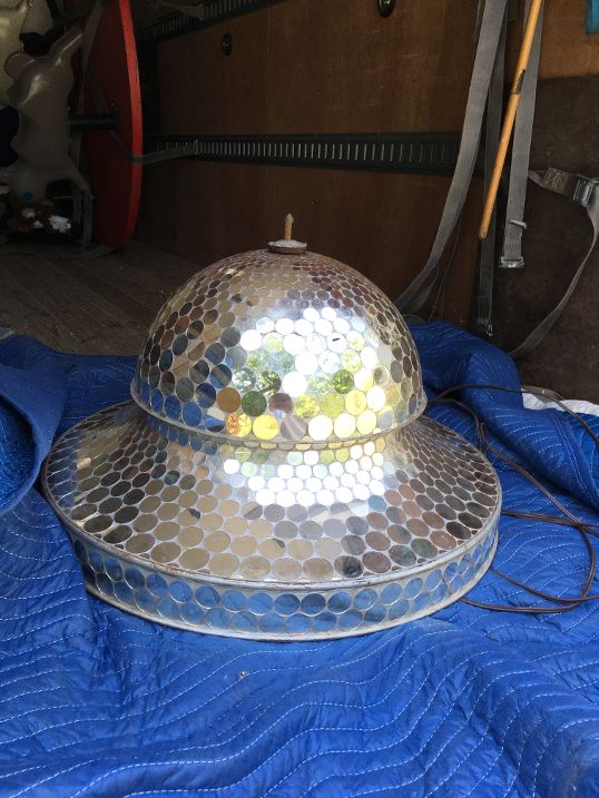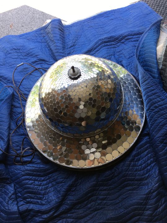 Vintage art deco dance hall revolving mirrored ballroom ball in as found working condition. Nice overall condition needing a good cleaning with a few cracked mirror tabs measuring 21″ tall x 30″ diameter. Grab a partner and lets dance………….