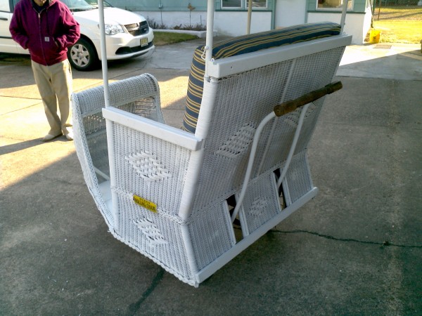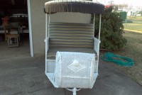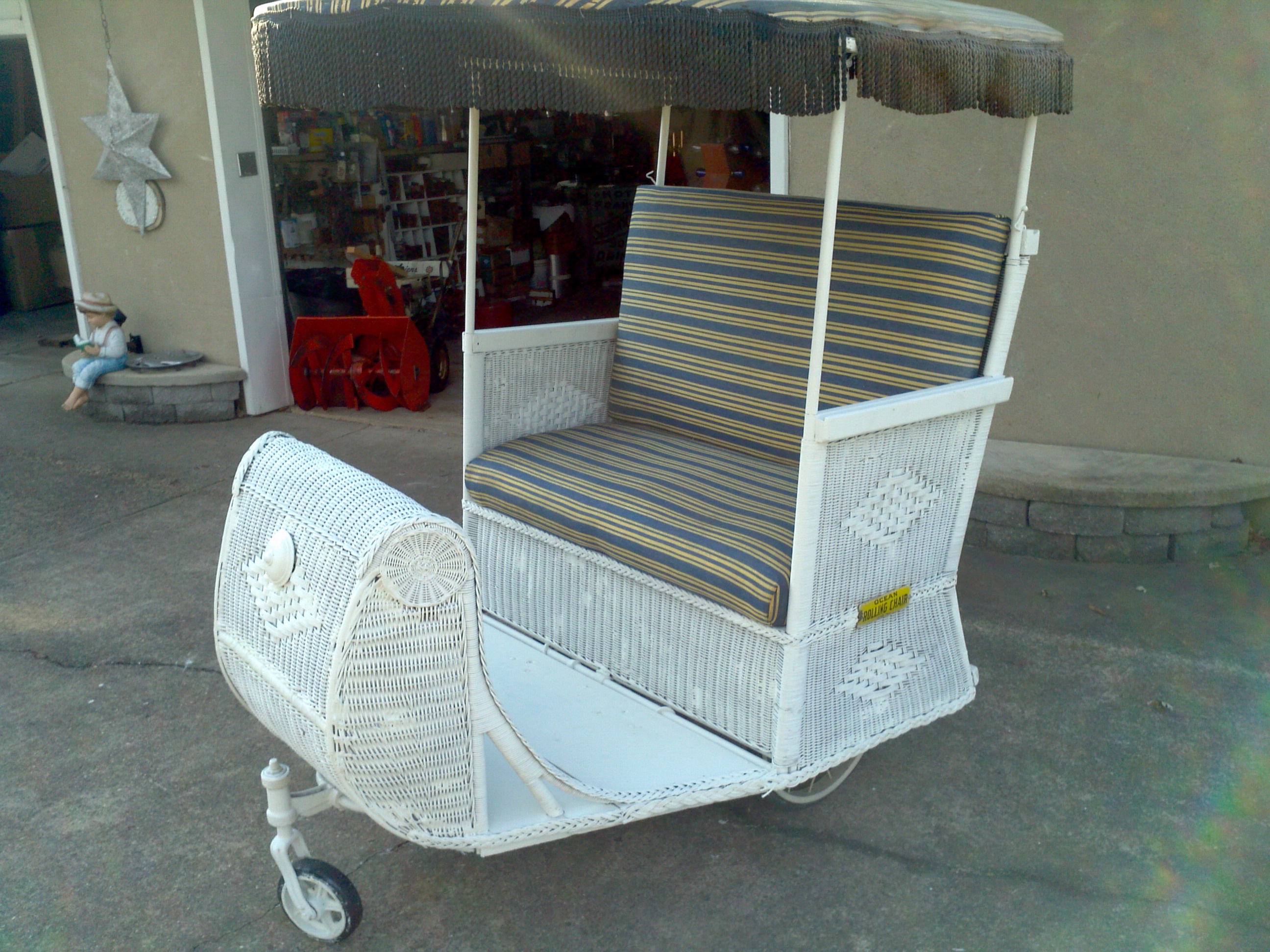 Antique Atlantic City rolling chair push cart from the Atlantic City boardwalk. Some wicker restoration has been done but otherwise in very good condition to use or display. Hard to find with original hardwood and canvas top. Nice for the porch or patio……