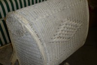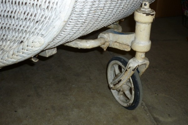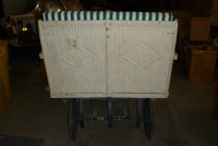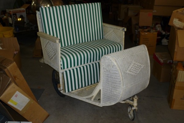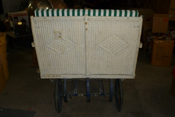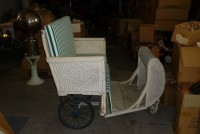 A fine example of an early Atlantic City wicker rolling chair produced between 1870-1930. Typically used to transport visitors up and down the boardwalk . Nice original wicker and cast metal wheels. The canopy and fabric seats are not original but looks fine. May need some minor tightening but should display well………..