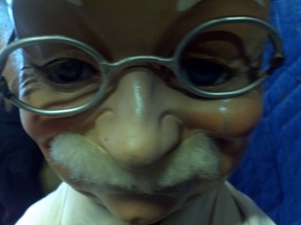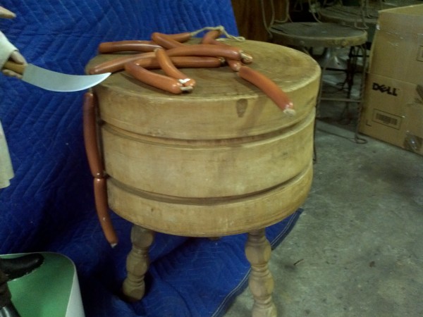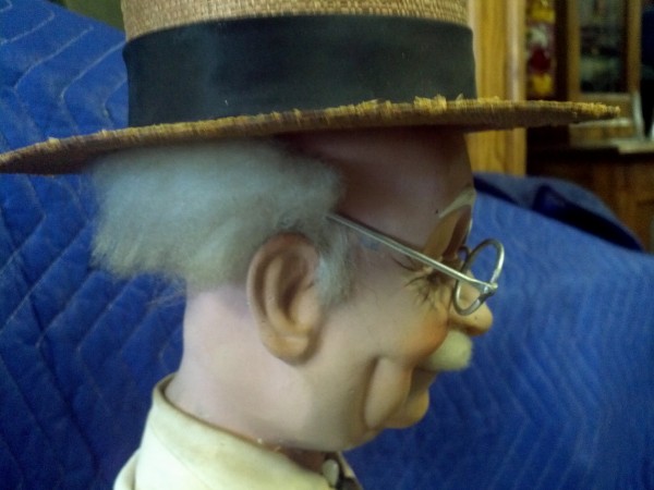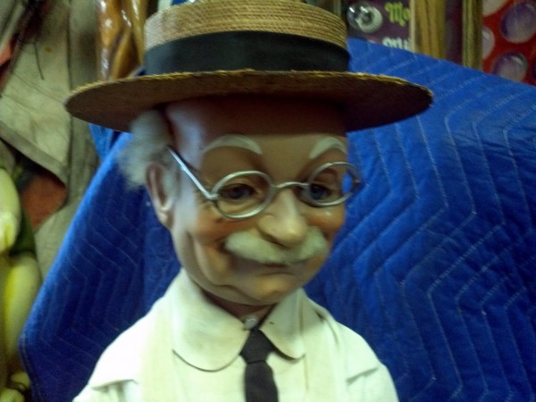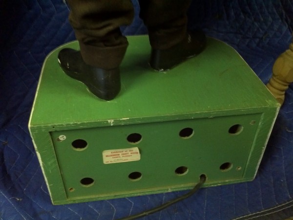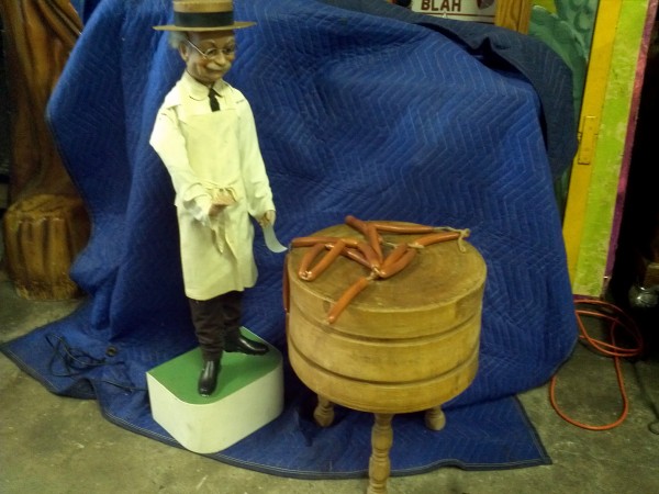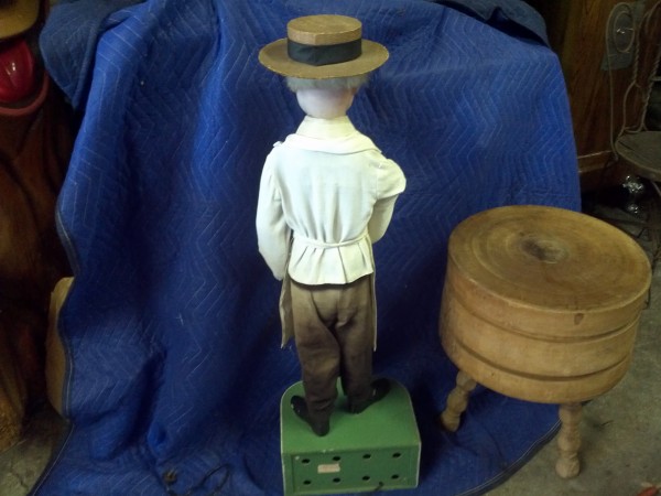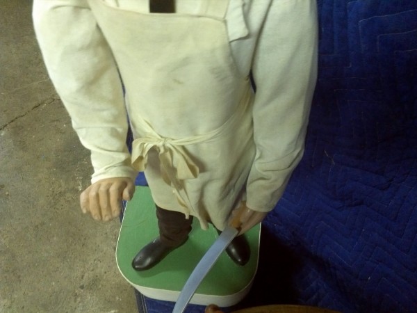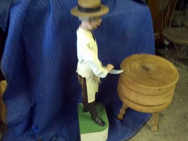 Beautiful, old, vintage Butcher Shop automaton window display in working condition. The little guy is 42″ tall, head moves as his left arm slices sausage. Glass eyes move also. Real butcher block. Great condition for displaying in almost any room or addition to any advanced collection………
