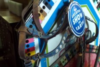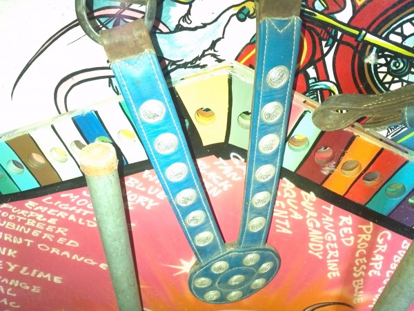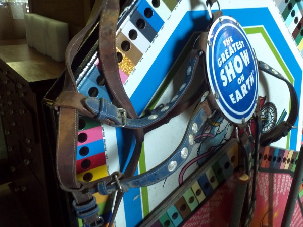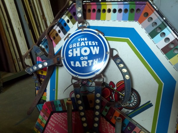 Vintage Ringling porcelain over steel circus elephant headdress in as found condition. Comes complete with all the leather trappings. Two available. Hard to find…………