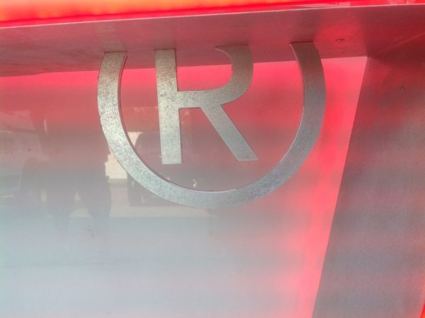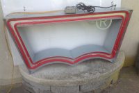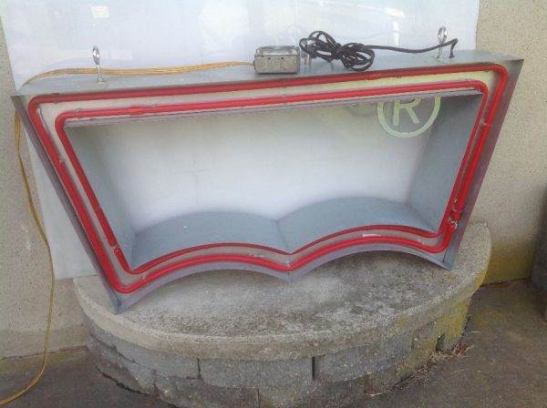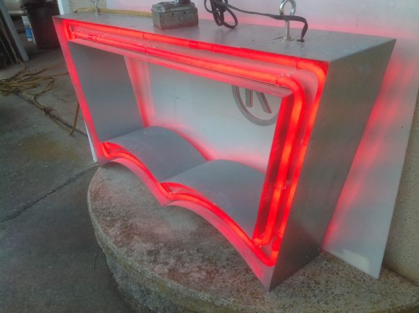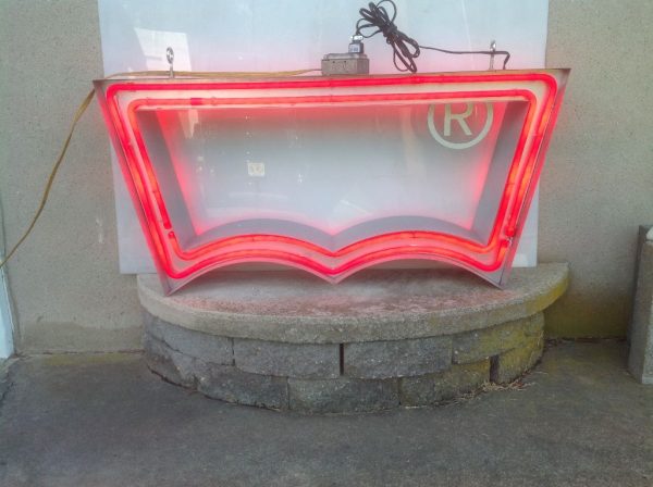 Nice double sided Levis Jeans store sign in as found working condition. Stylized neon looking LED lighting from the 1980’s. Aluminum can. Fantastic looking for displaying…….