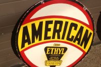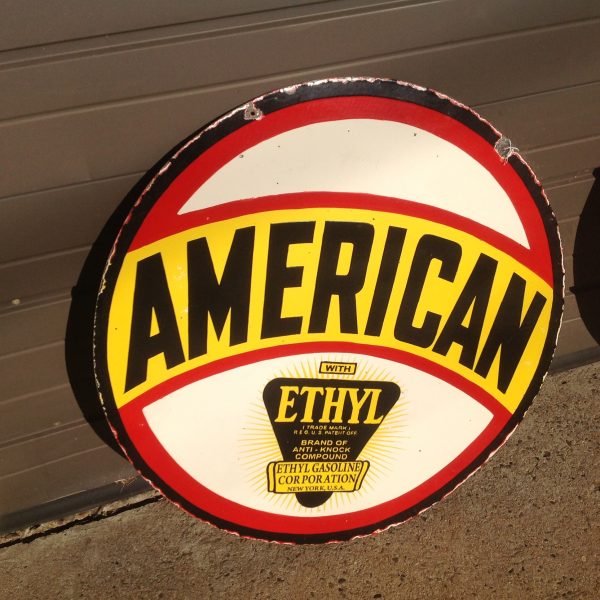 Another beautiful sign. Old double sided American Ethyl porcelain over steel sign from a local sign collector in as found condition measuring 30″. Fantastic sign for its age with some minor rim chips but otherwise in very nice condition. Ready for displaying…………..