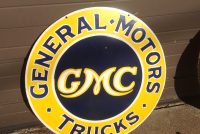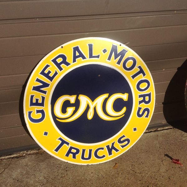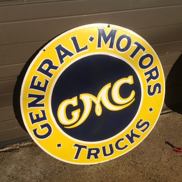 General Motors old double sided porcelain over steel sign in as found condition form local auomotive sign collector measuring 30″. A few minor rim chips but nothing to distract from the beauty of this sign. All it needs is a space on wall…………..