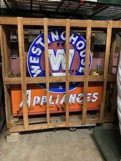 Double sided porcelain faced Westinghouse Appliance neon sign in as found condition. Crated and ready for minor restoration as some of the neon need to be replaced. All new neon replacement glass has been bent and ready to be installed by the new owner. New glass is included in sale. Just don’t have the time to complete the job, so selling as is. Bright porcelain colors. Now’s your chance to own a beautiful neon sign………..
