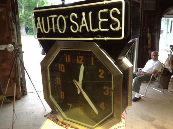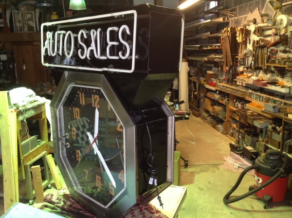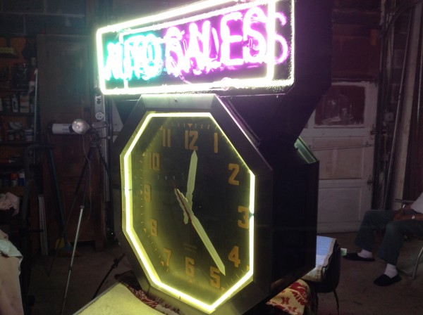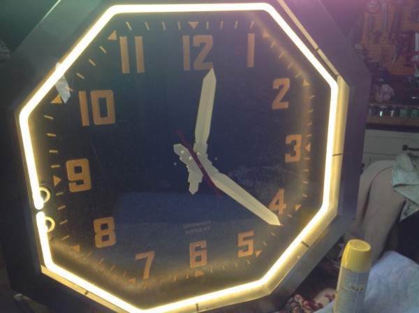 Rare, huge, 1950’s double sided advertising neon clock in as found restored working condition. Estate find, where the owner could not take because of no room in his new condo. Very difficult to find a working double sided neon clock in this condition. Great attention getter…………….