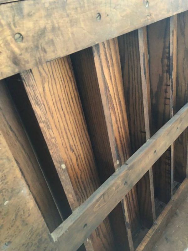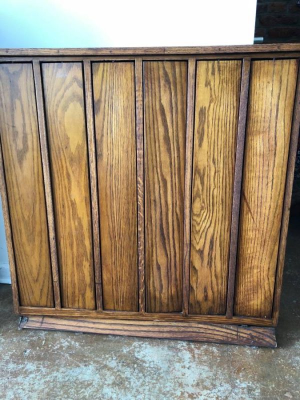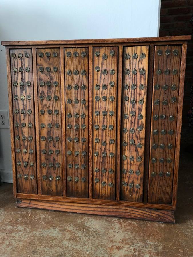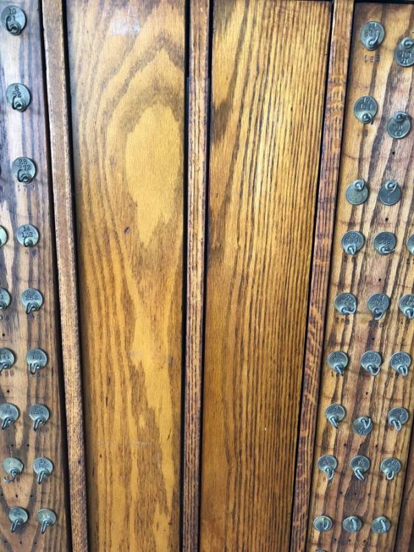 Vintage,1920’s/1930’s E.H. Sheldon Oak science lab key holder in as found condition. Solid oak with some restoration done years ago. Missing a few brass numbers but otherwise in original shape. Six panels rotate 360 degrees to allow keys to be hidden along with a locking flap mechanism on the bottom. Measures 36.5″ wide x 36.5″high x 4.5″ deep. You may never see another……………