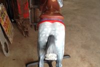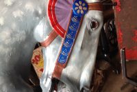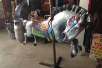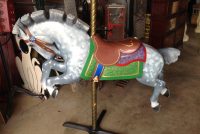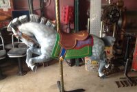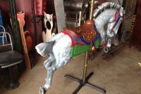 Antique 1915-1930 Trojan Style Carousel Horse by Allen Herschell in as found restored condition. Beautifully painted outside row jumper with tightly tucked head, powerful stance and chopped mane and tail. The Trojan style horse sets it apart from other Allen Herschell horses making horses like this a rare find. Complete with stand. Ready to display……..