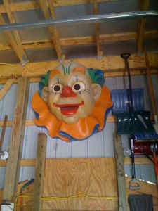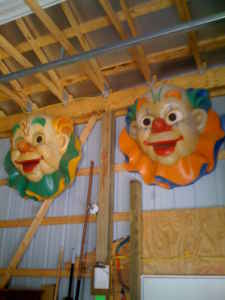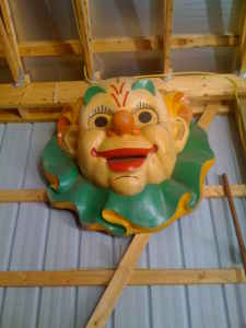 A pair of clown heads from a closed amusement park in Michigan. Park has been closed for many years and these were the only remaining park items left. Measuring 48″ in diameter and protruding from the wall 24″ . Will display and hang well in any room in the house…………