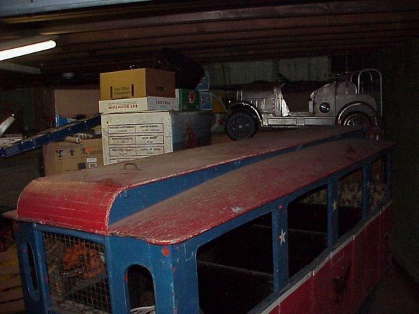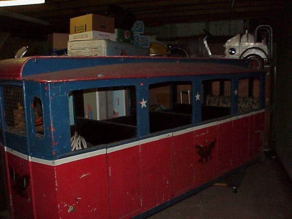 Early vintage amusement park electric Cagney Brothers train in as found condition. Manufactured in Jersey City, New Jersey back in the early 50’s. Believed to one of 3 ever produced and used on the Boardwalk, Pt. Pleasant, New Jersey. Sweep and track are gone but the electric motor is there. Train will need to be restored. Looks like all the important items are present, maybe missing a few decorative pieces. Comes complete with engine and one car. A true piece of Americana. For the right person who needs a restoration project. May never see another………..