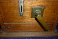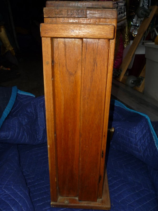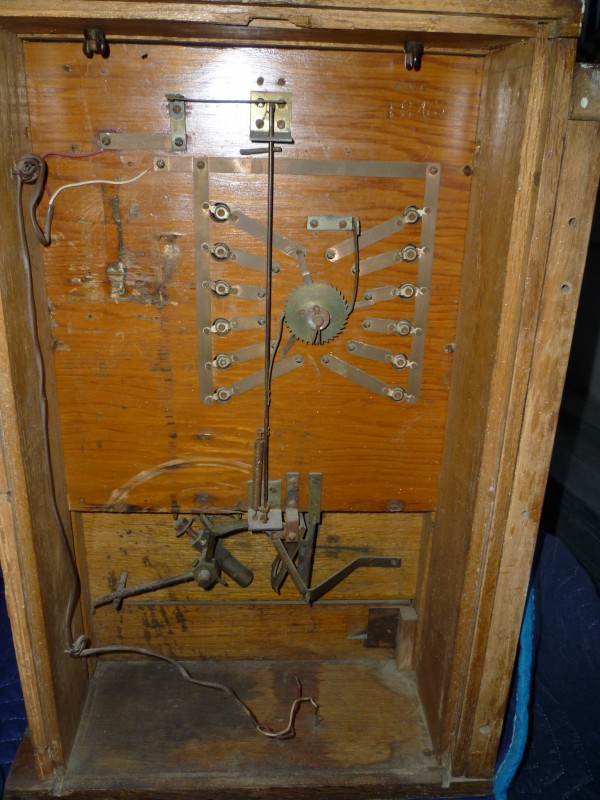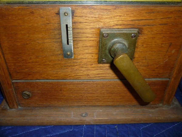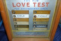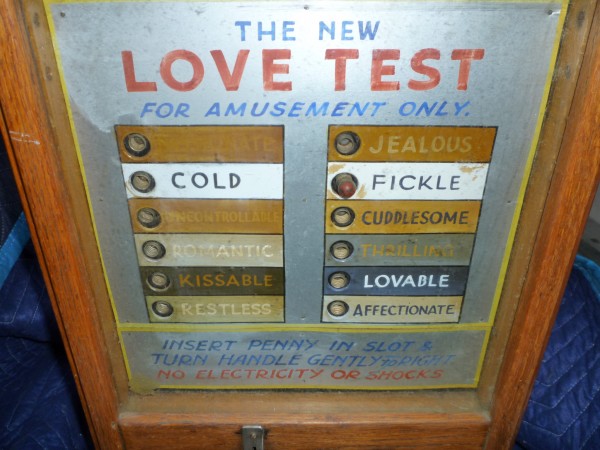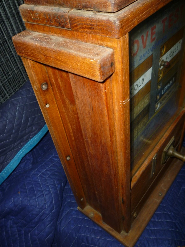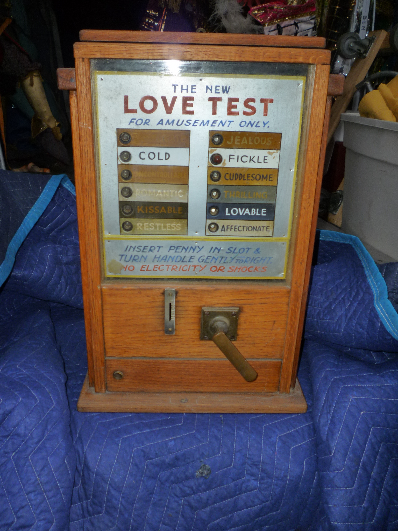 Nice example of an early penny arcade counter top love tester. Primitive coin mechanism. Needs a good cleaning,some bulbs and a back door. Will display well.