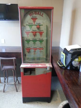 Early penny arcade High Ball machine in as found condition. Machine will need restoration. Missing coin entry door but otherwise looks to be complete. Hard machine to find…….