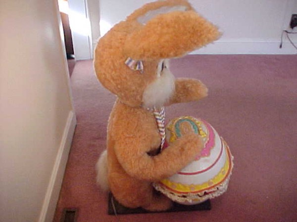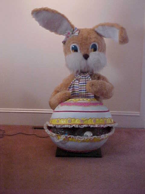 Found in storage, this animated easter bunny will amaze any child. Bunny turns his head, moves his arm, as the egg opens and closes just enough to get a quick peak inside. Measures 36″ tall x 24″ wide x 30″ deep. Great shape for his age……………