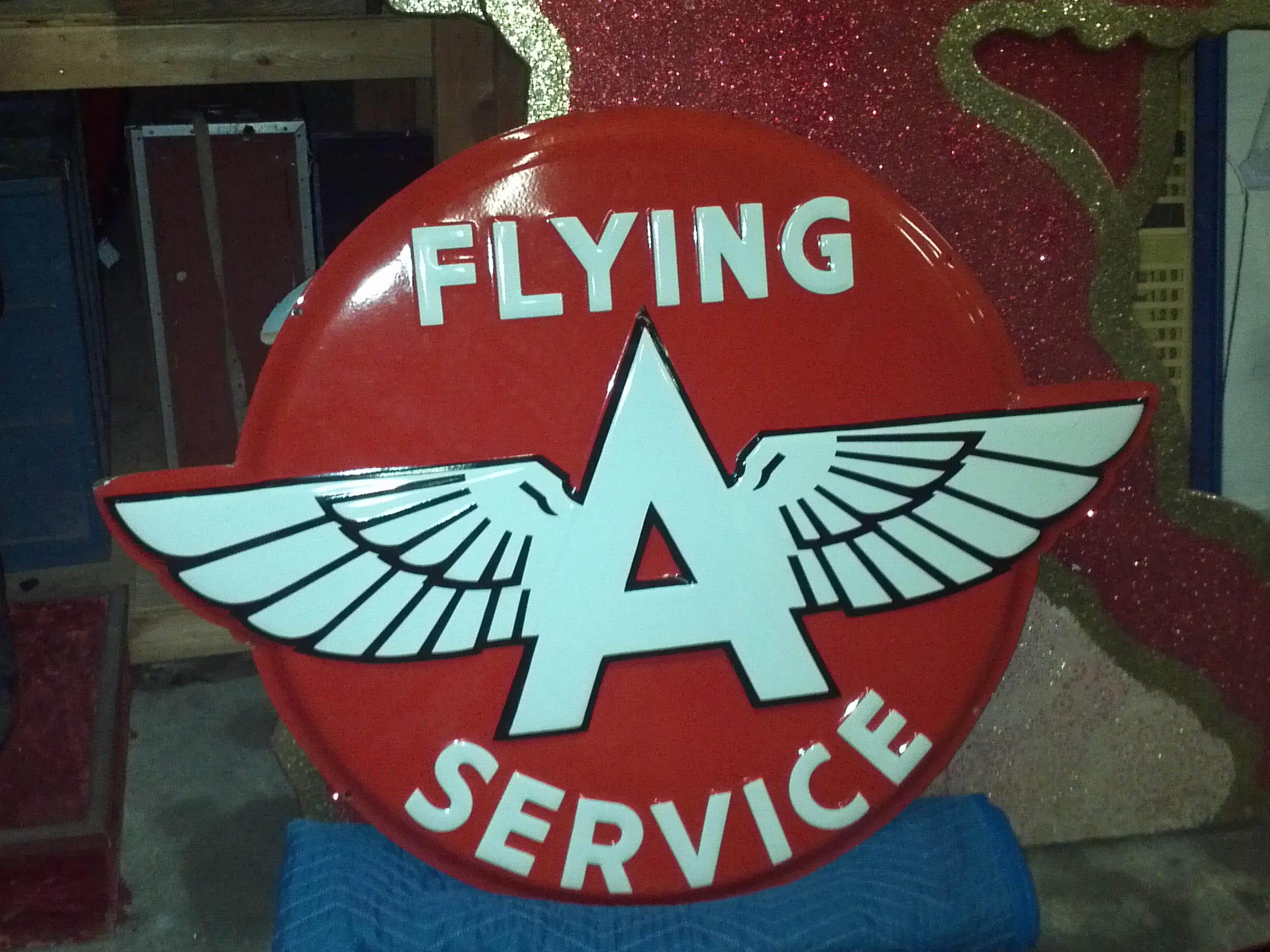 Take a look at this. New old stock, never hung, Flying A porcelain over steel sign, measuring 42″ tall x 54″ wide. Great bright colors with only 2 minor defects. Want the best for your collection, then consider this sign. Ask questions if more detailed pictures are required……