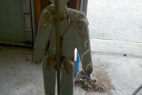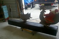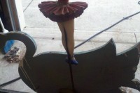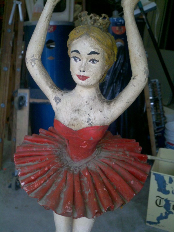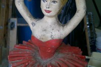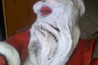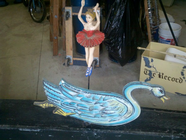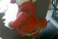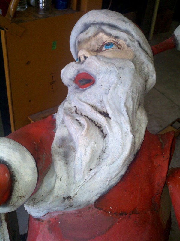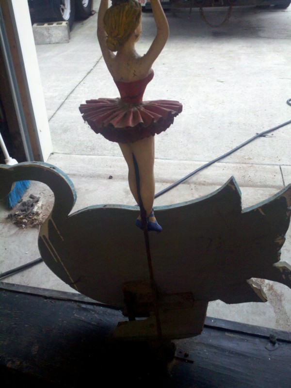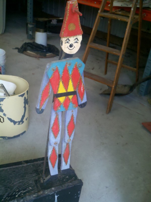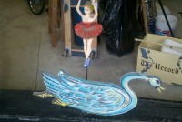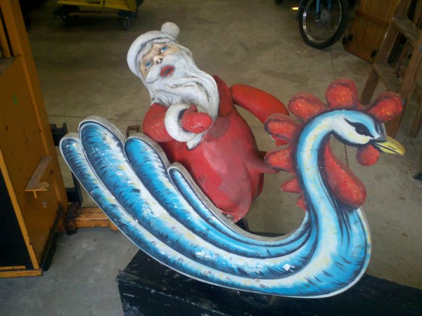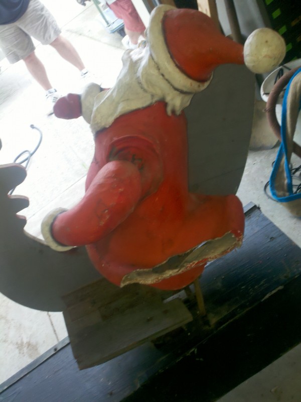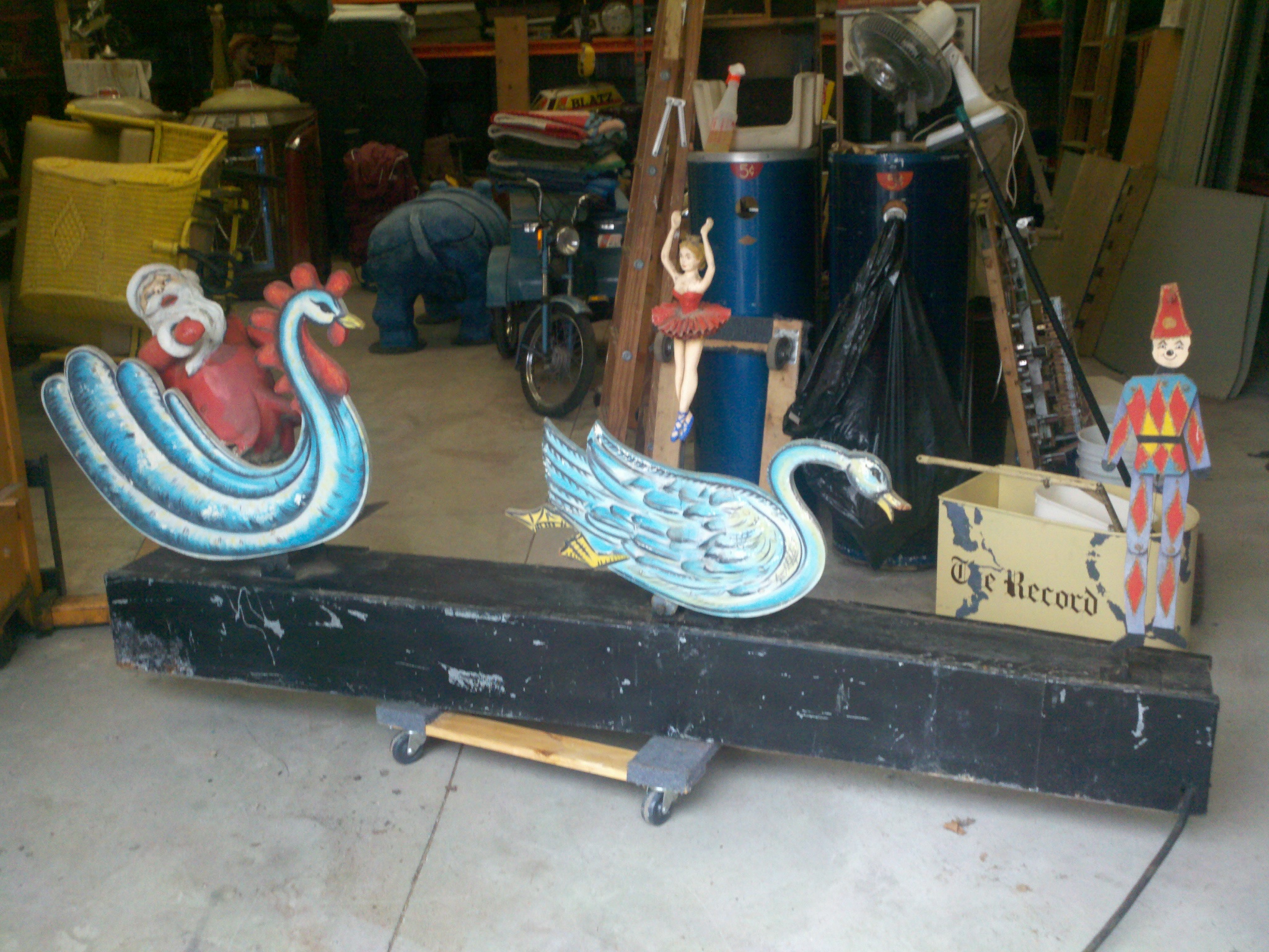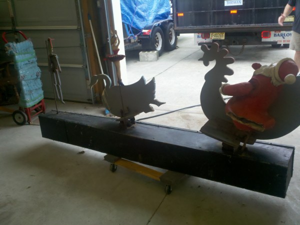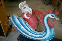 Motorized folk art Christmas toy store animated window display in working condition. Santa  and ballerina are paper mache. Swan , duck and clown are wood. Santa turns side to side, swan and duck rock up and down, ballerina turns a full circle and clown moves his hands and feet.  A nice example of early folk art animation……….