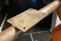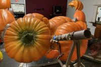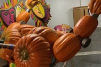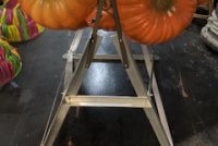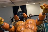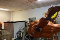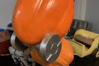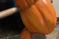 Massive over 10′ tall giant Halloween Pumpkin Robot Statue display from the Franklin Institute, Philadelphia. Sturdy foam core construction with a heavy fiberglass material coating in as found condition. Complete needing some minor foam restoration but overall in very nice condition for displaying. Separates in 2 pieces. Head, arms and upper body are racked on a aluminum frame for transport. Eyes are illuminated. New this “Guy” sells for over 10k. Great opportunity to add a real crowd pleaser to your Halloween display……………..