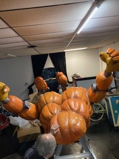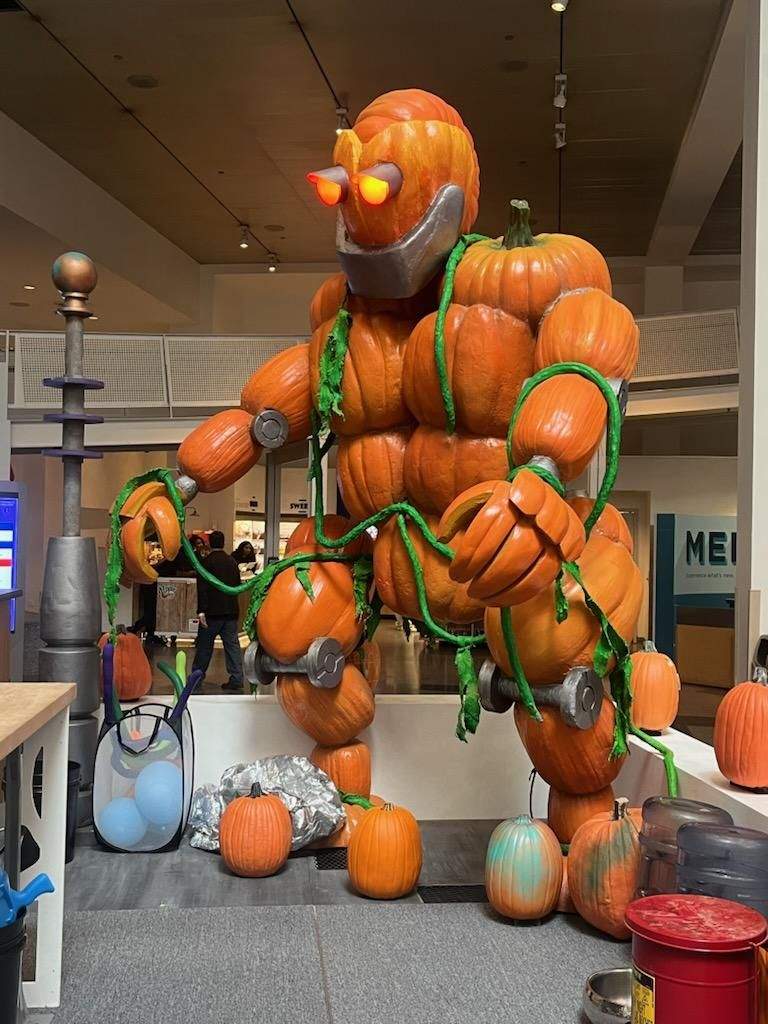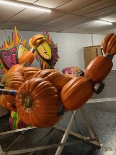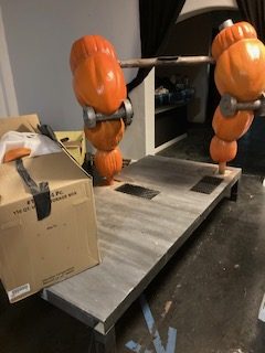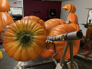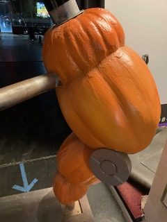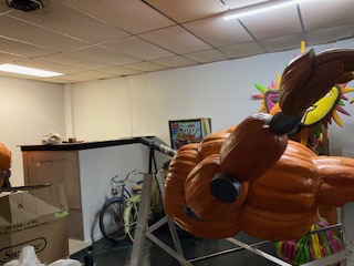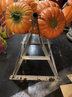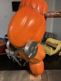 Massive over 10′ tall giant Halloween Pumpkin Robot Statue display from the Franklin Institute, Philadelphia. Sturdy foam core construction with a heavy fiberglass material coating in as found condition. Complete needing some minor foam restoration but overall in very nice condition for displaying. Separates in 2 pieces. Head, arms and upper body are racked on a aluminum frame for transport. Eyes are illuminated. New this “Guy” sells for over 10k. Great opportunity to add a real crowd pleaser to your Halloween display……………..