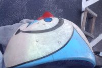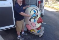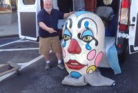 Large vintage Ringling Brothers clown head in as found condition. Head was used on a Ringling float back in the late 70’s early 80’s. Heavy, made of old style foam and a thick layer of fiberglass sealant. Face has a few dings but otherwise in good condition. Measure about 48″ tall x 36″ wide. Nice colors and a fantastic find……….