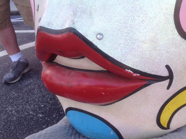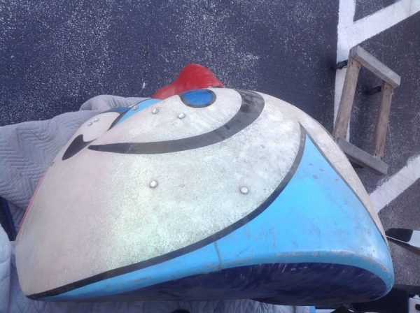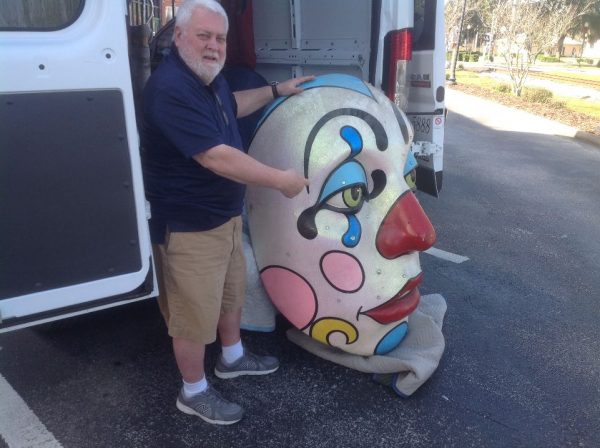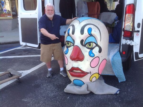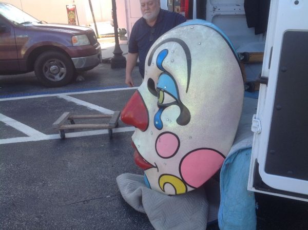 Large vintage Ringling Brothers clown head in as found condition. Head was used on a Ringling float back in the late 70’s early 80’s. Heavy, made of old style foam and a thick layer of fiberglass sealant. Face has a few dings but otherwise in good condition. Measure about 48″ tall x 36″ wide. Nice colors and a fantastic find……….
