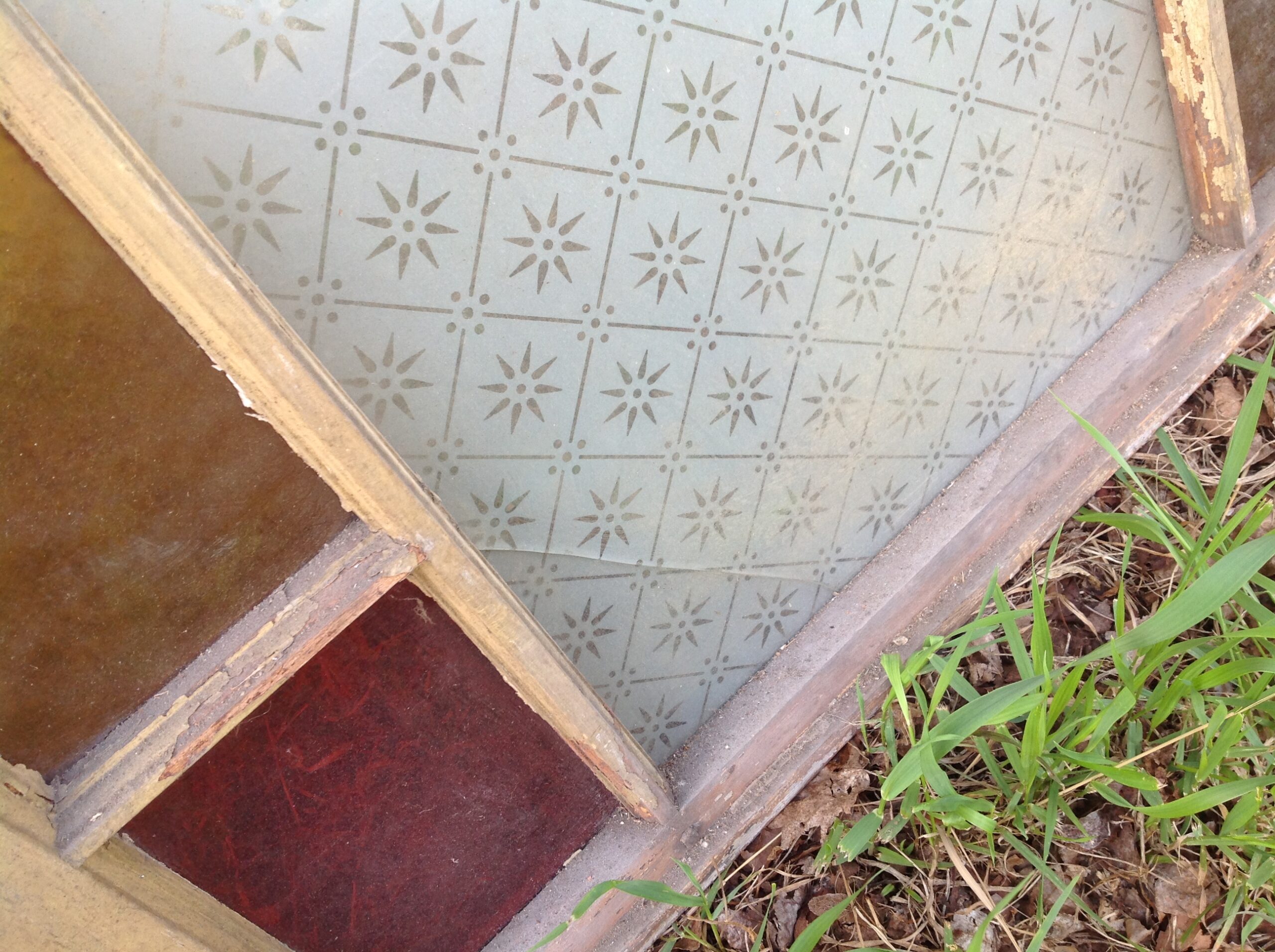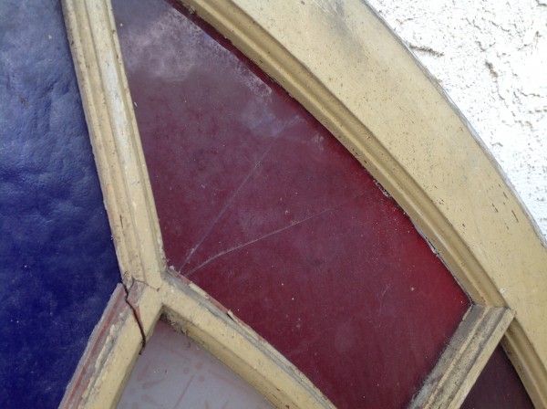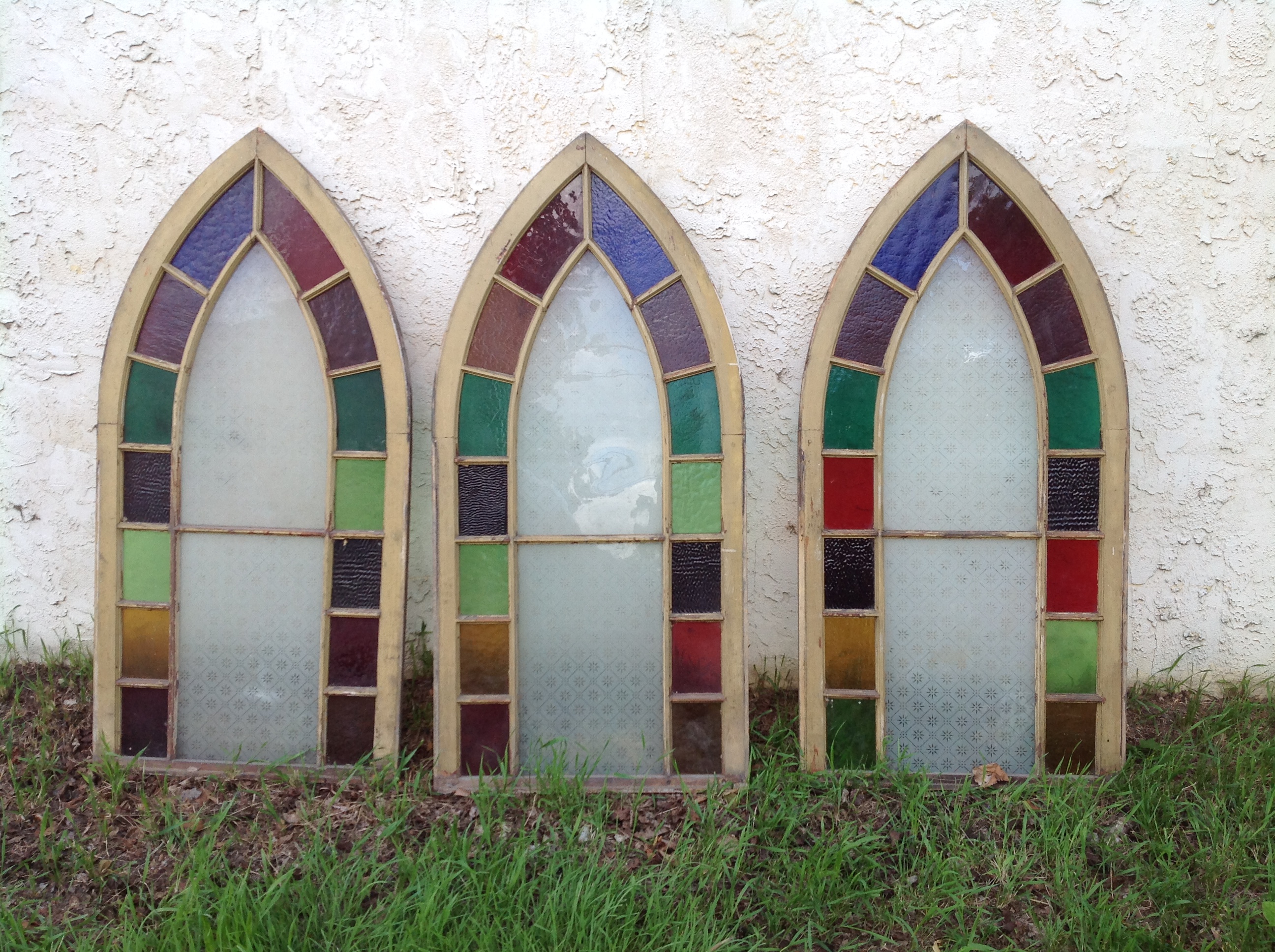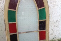 Group of 3 antique church stained glass windows in as found condition. One window is perfect, the remaining 2 are not. One has a crack in a stained glass section while the other has a crack in the white section as well as a piece of stained glass. Measures about 50″ tall x 28″ wide. Exact measurements are available upon request………