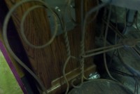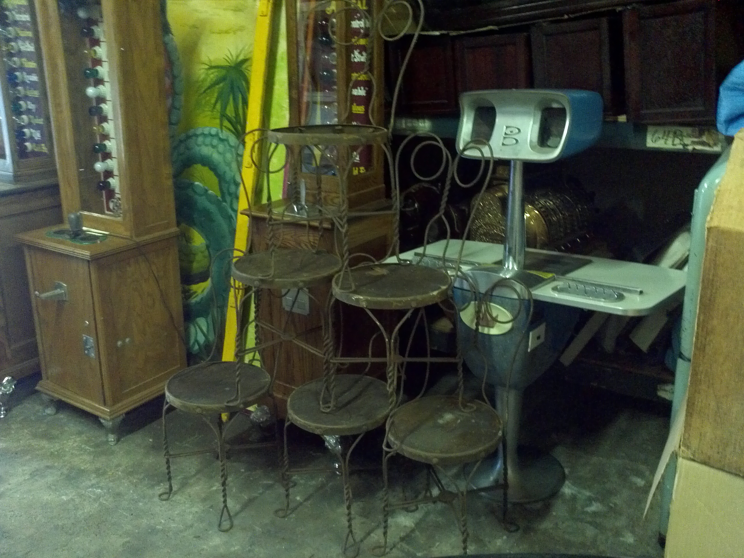 Group of 6 twisted wire, vintage ice cream parlor chairs in as found condition. 5 have oak seats, one missing. Will need restoration. Good winter project……..