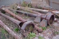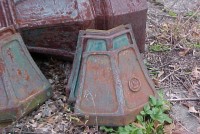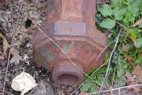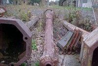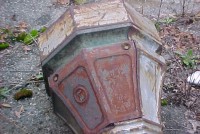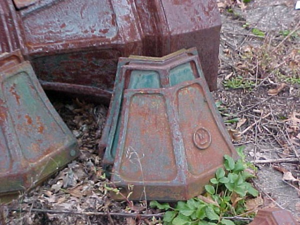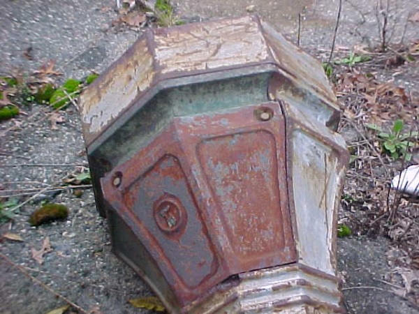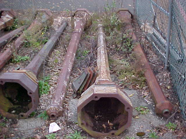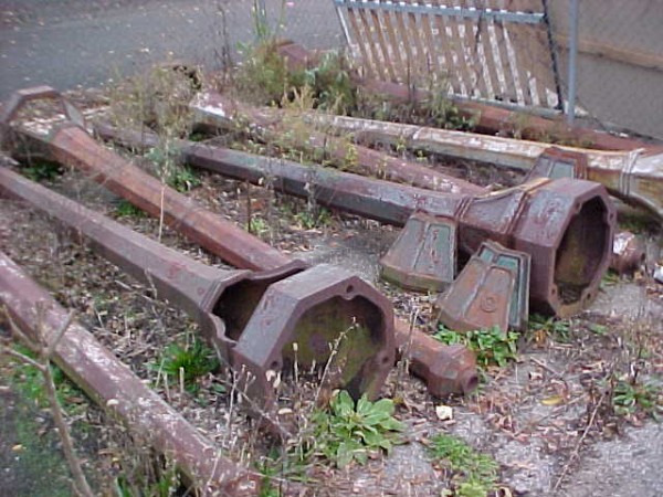 Grouping of 7 cast iron lamp posts from a New Jersey estate. Each post measures 12′ and has a side cover. Heavy and will need restoration…….
