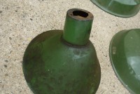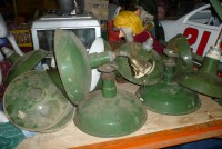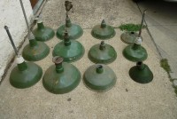 As found grouping of porcelain over steel reflector shades as used in old gas station and barn lighting. Nice example of early shades sold as a group only. Great for a car or gas station collector…….