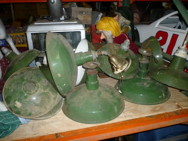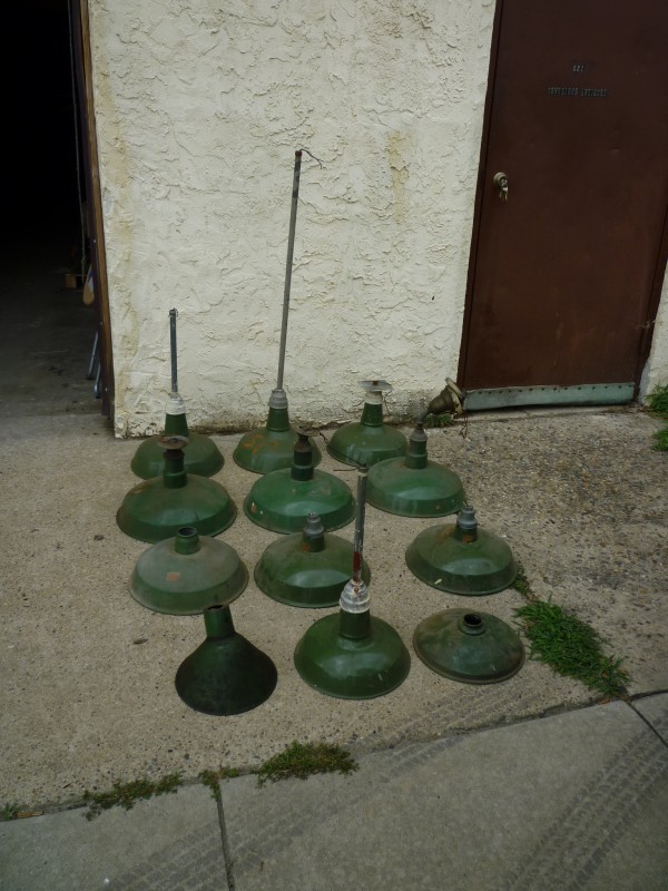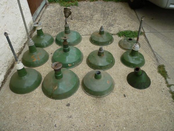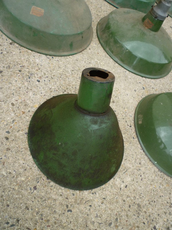 As found grouping of porcelain over steel reflector shades as used in old gas station and barn lighting. Nice example of early shades sold as a group only. Great for a car or gas station collector…….