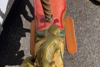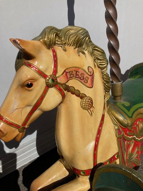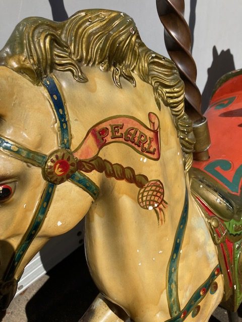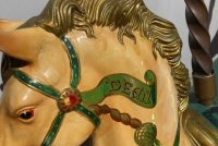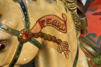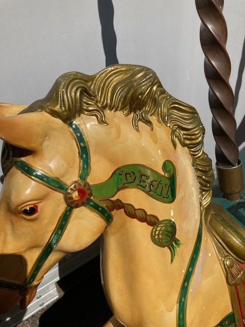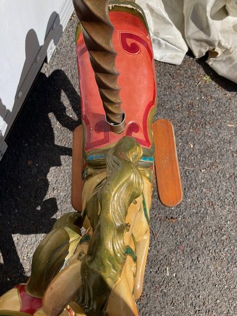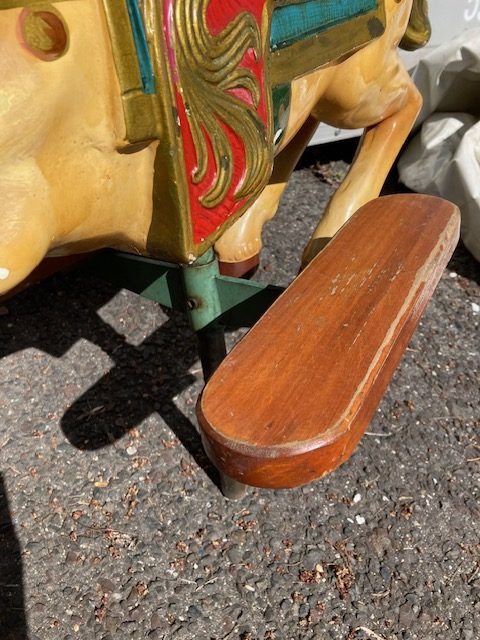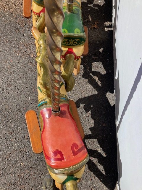 Group of English 1960’s Child Size Carousel Horses in as found condition. Fiberglass construction complete with brass pole. Approximately 4′ long. Sold by the piece. Very affordable for the carousel horse look.