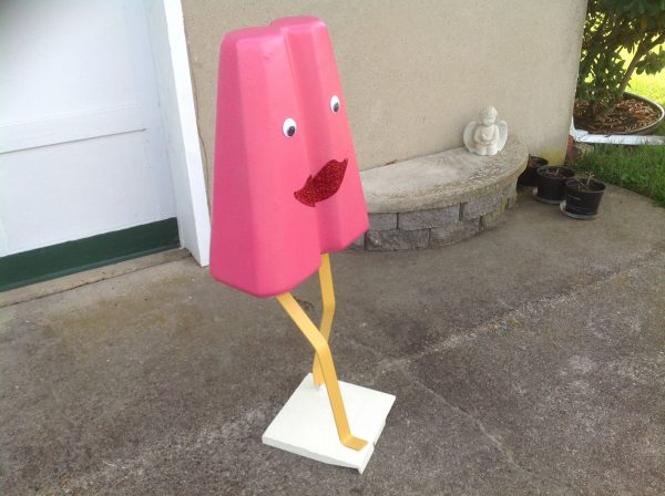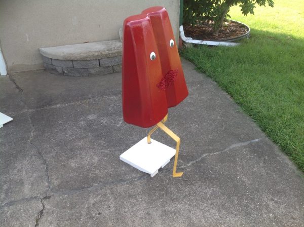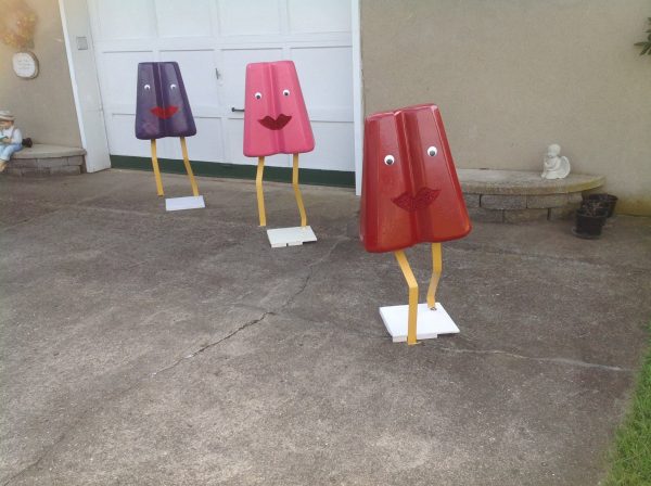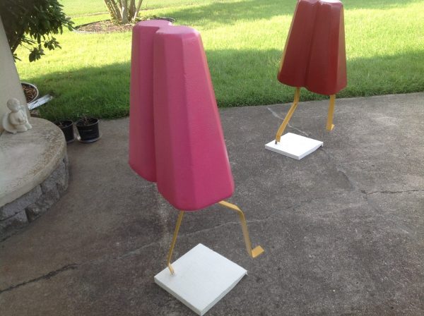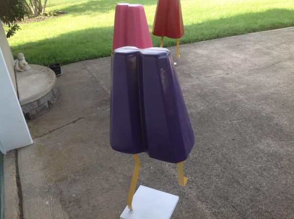Grouping of 3 vintage movie theater snack bar popsicles in as found condition. These are just wonderful, measuring between 42″ to 47″ tall depending on flavor and 18″ wide. Made of foam core with a hard outside covering. Please let these beautiful “Girls” walk into your life……………Two sold, only purple remains……….
