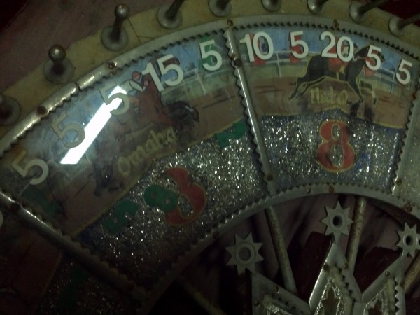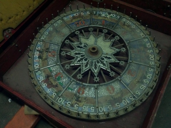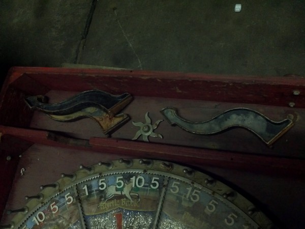 Barn fresh H.C. Evans horse race gambling wheel in as found condition with stand. Stand may need some minor welding and wheel will need cleaning. Not reverse painted horse scenes but some other material. Looks decent but worn. Ask questions if interested……….
