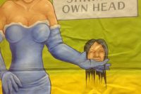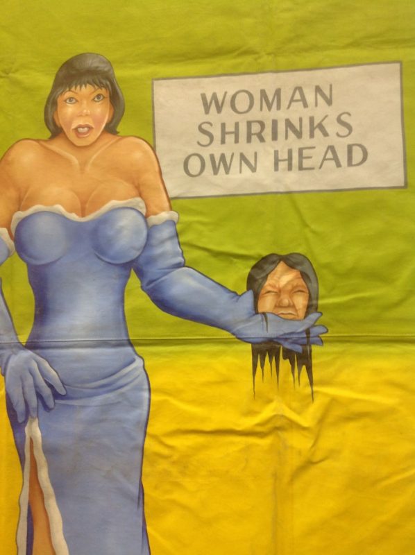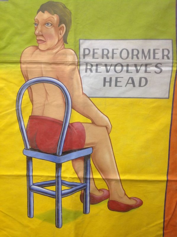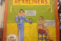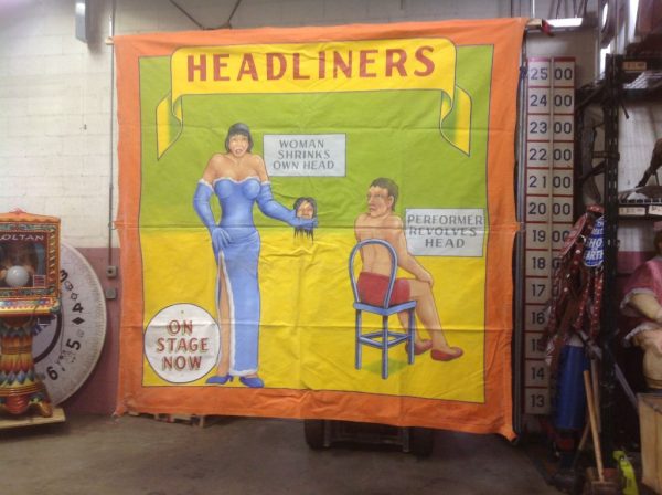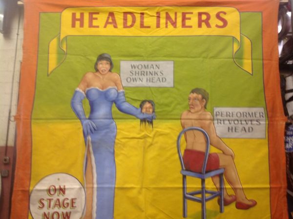 Johnny Meah’s Headliners sideshow freak bannerf in as found condition. Used in Ward Hall’s Famous World of Wonders Palace of Illusions sideshow banner line years ago. Measures 7′ x 7′. Good subject matter. Johnny Meah, one of the last of the sideshow banner painters at the ripe old age of 83, painted and signed this masterpiece. See photo below for banner line…….