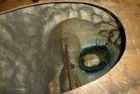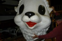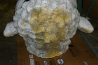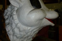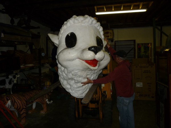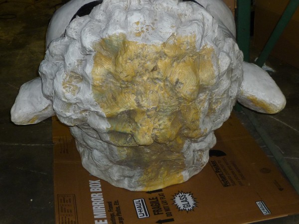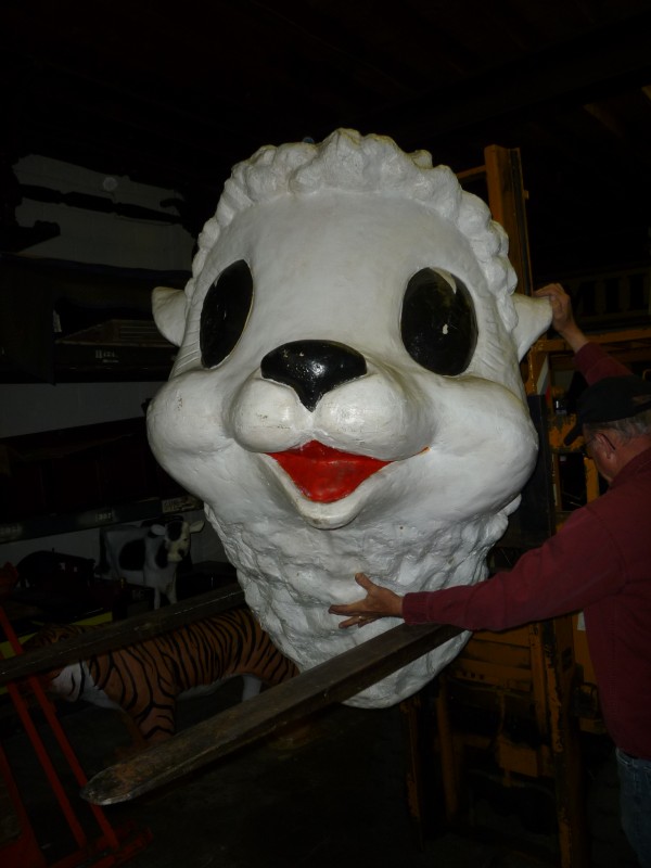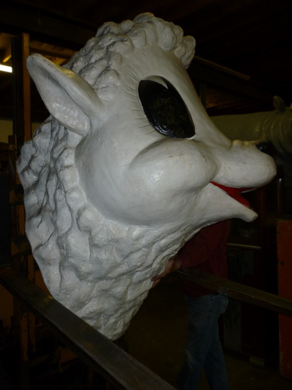 Huge fiberglass butcher shop advertising lamb head measuring 5′ tall x 5′ wide x 43″ . Last hung outside an old butcher shop in upstate New York. Good condition for hanging. Eyes have been covered over but can be removed for illumination. Pair it together with the bull and have some farm fun……….